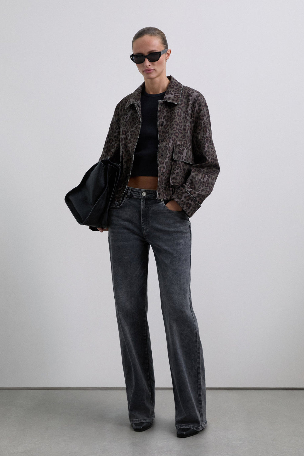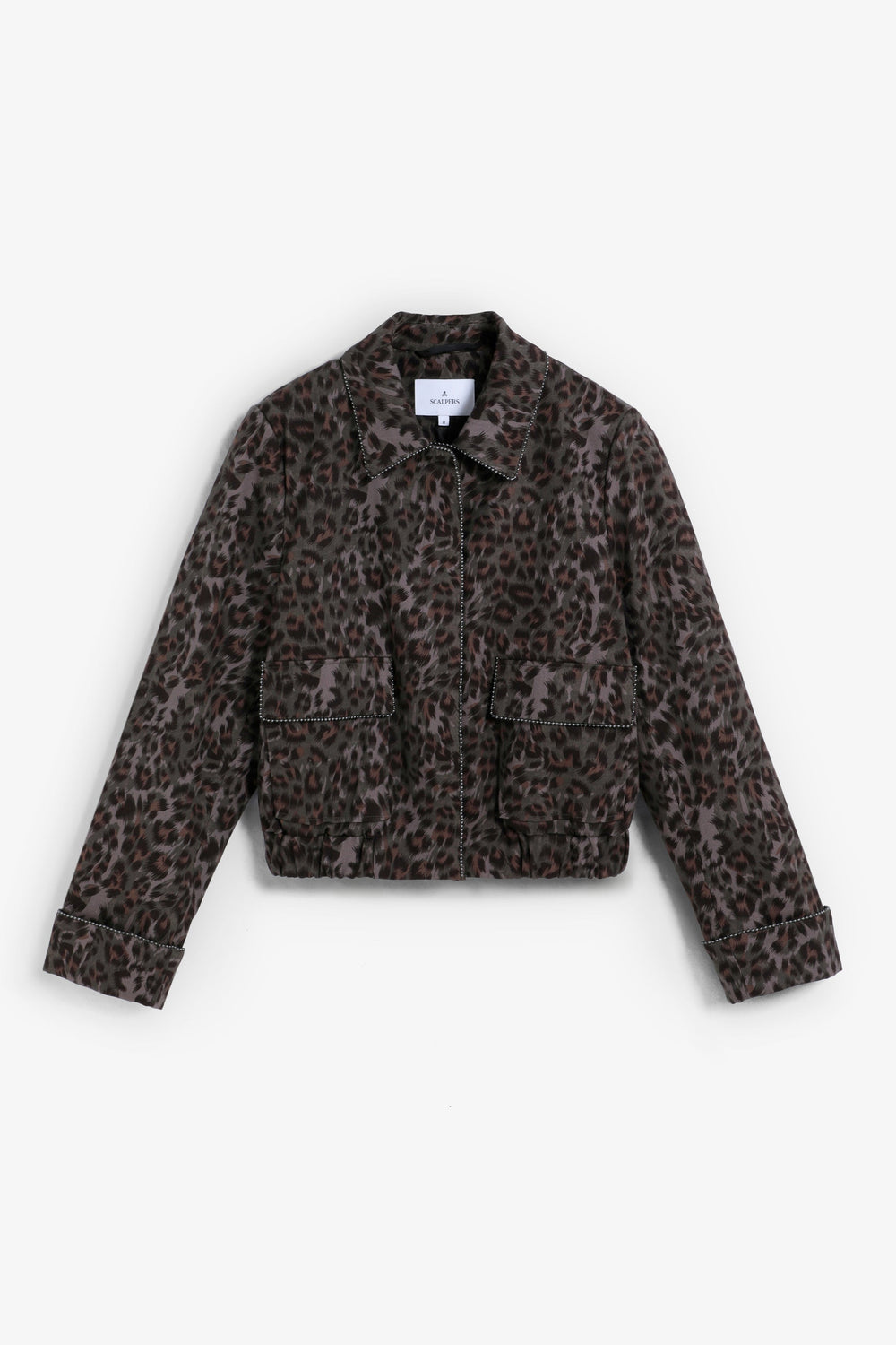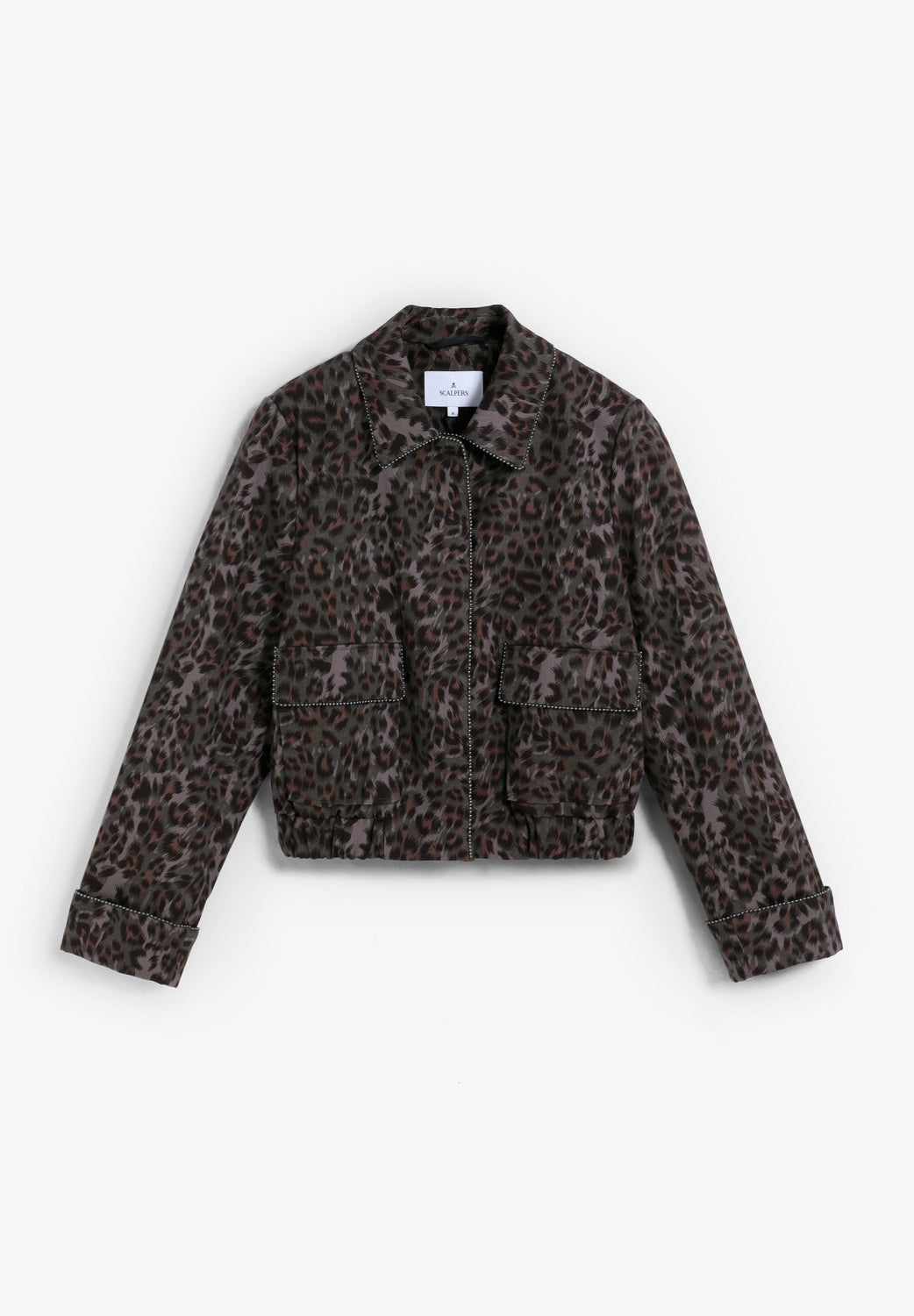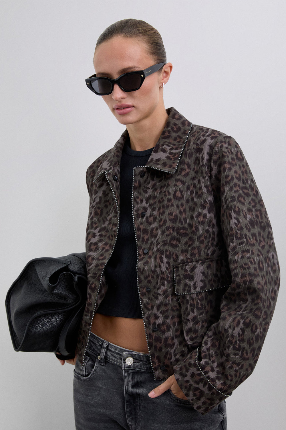 Jacket made of 100% cotton with animal print. Lining detail with metallic studs. Long sleeves with turn-back cuffs. Shirt collar. Button fastening concealed by a placket and a visible button. Two flap pockets. Elastic tabs on the sides of the hem.