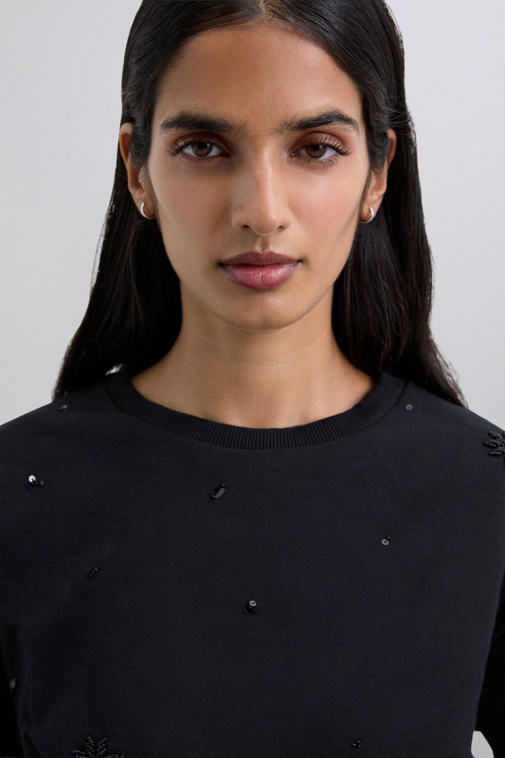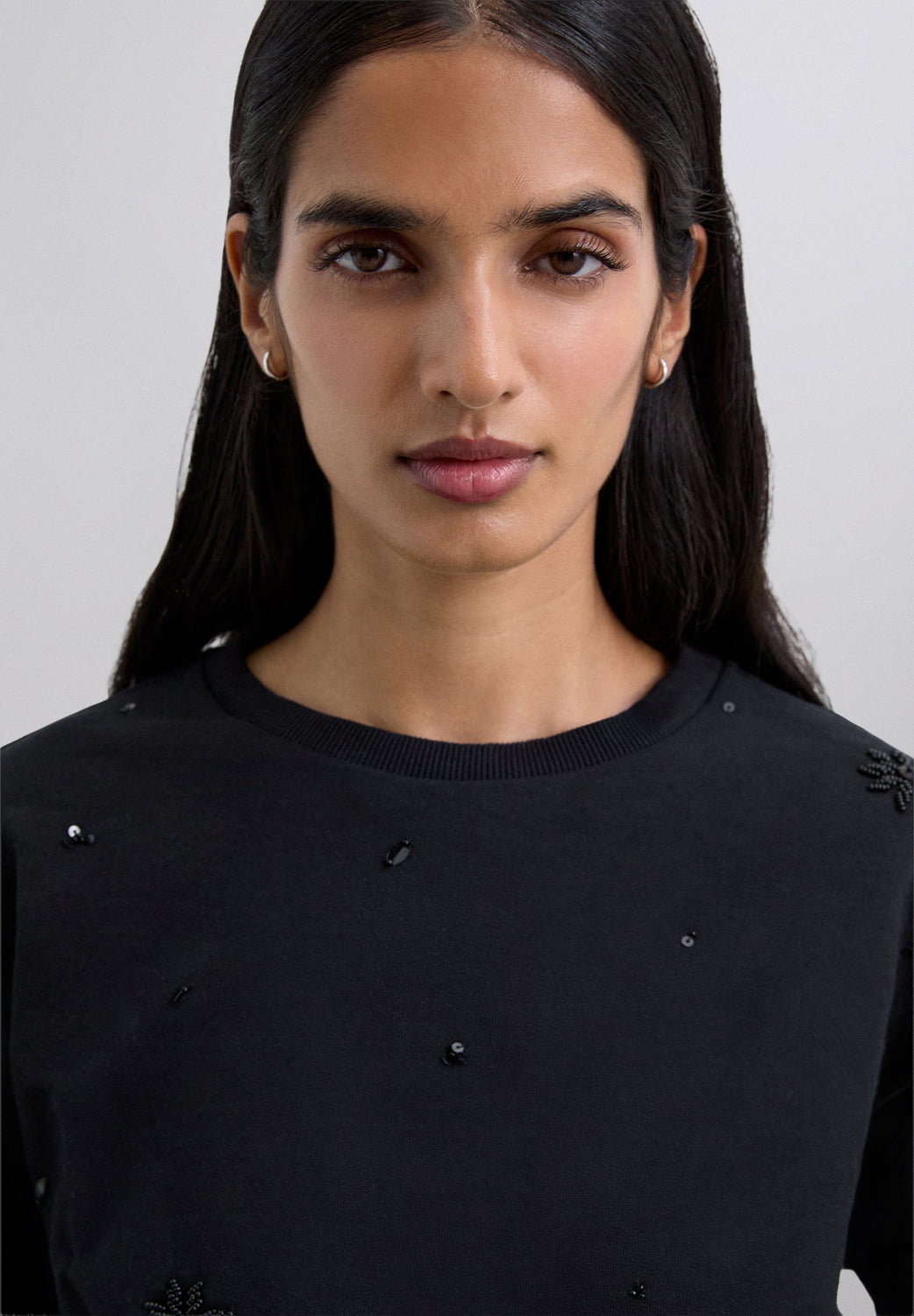 T-shirt made of 100% cotton with embroidered rhinestone details. Regular fit. Round neck, long sleeves with ribbed trim.