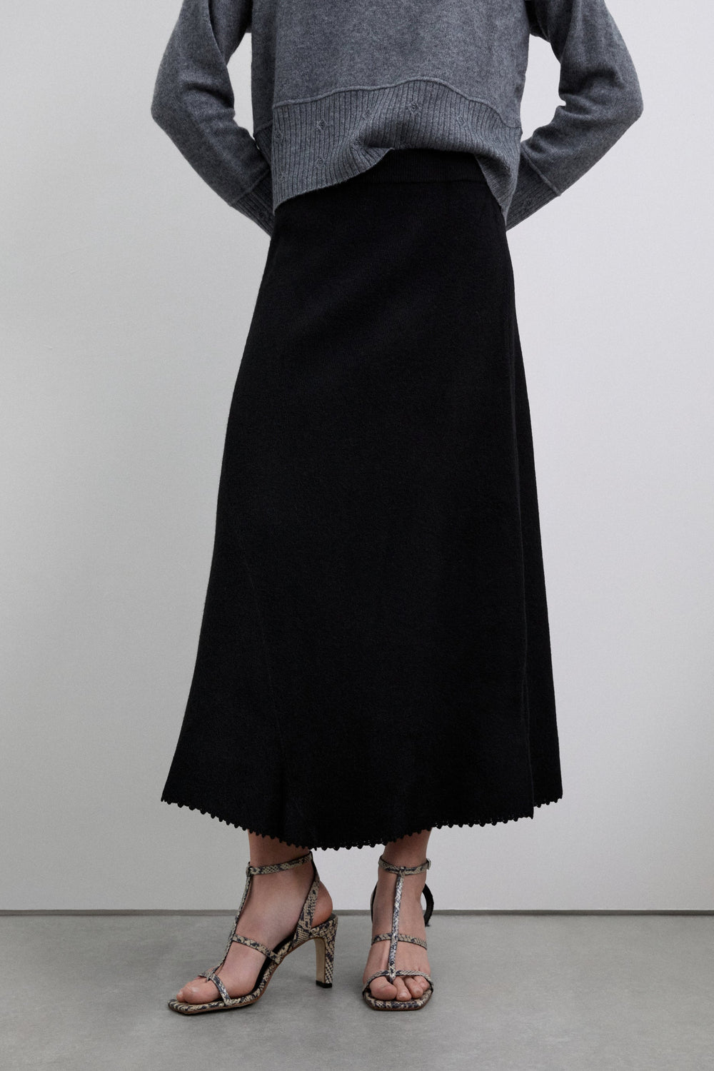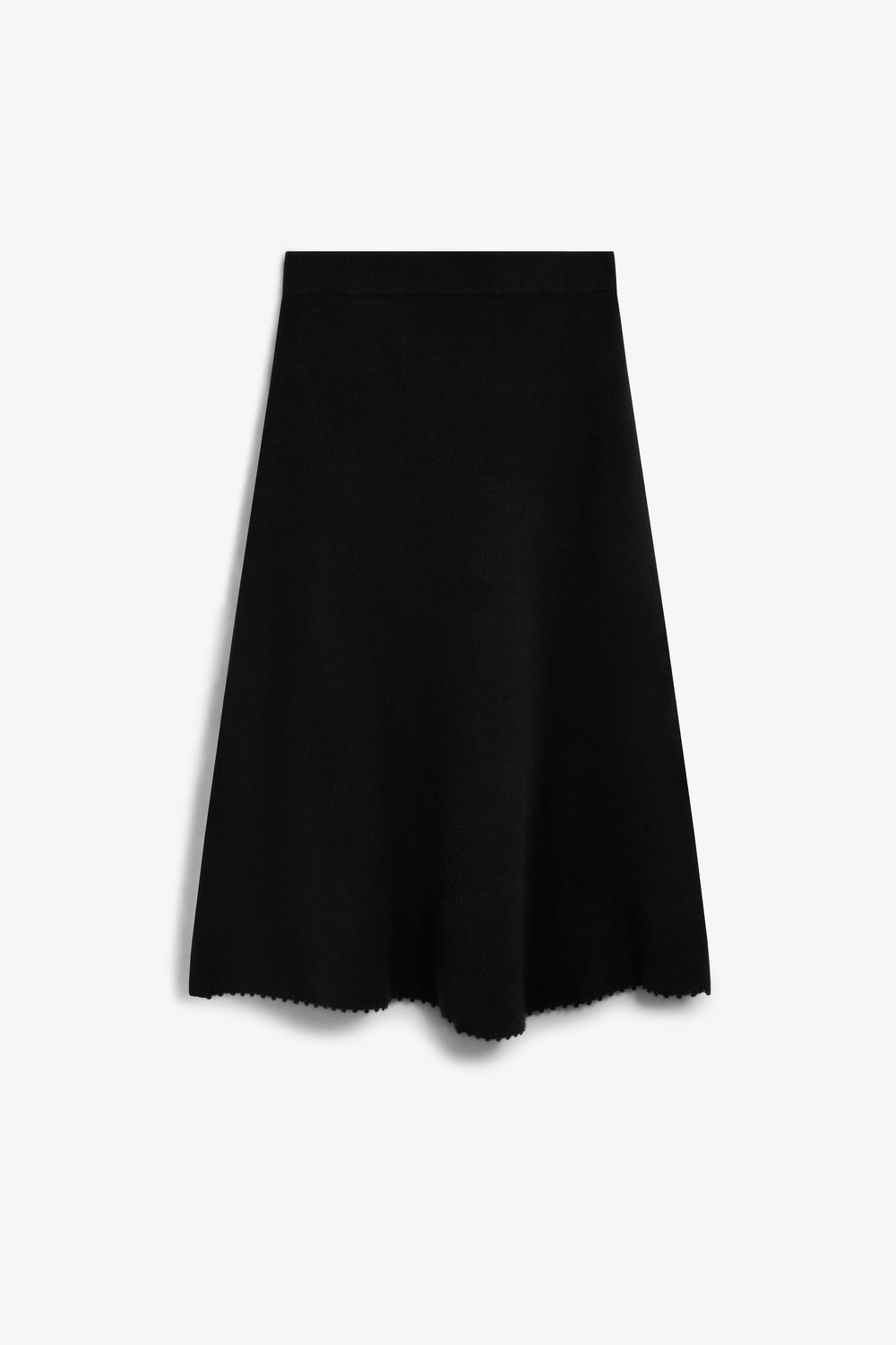 The skirt has an asymmetrical hem. It features a stitching detail along the skirt from the side to the hem. The hem is finished with special stitching. Elastic waistband.