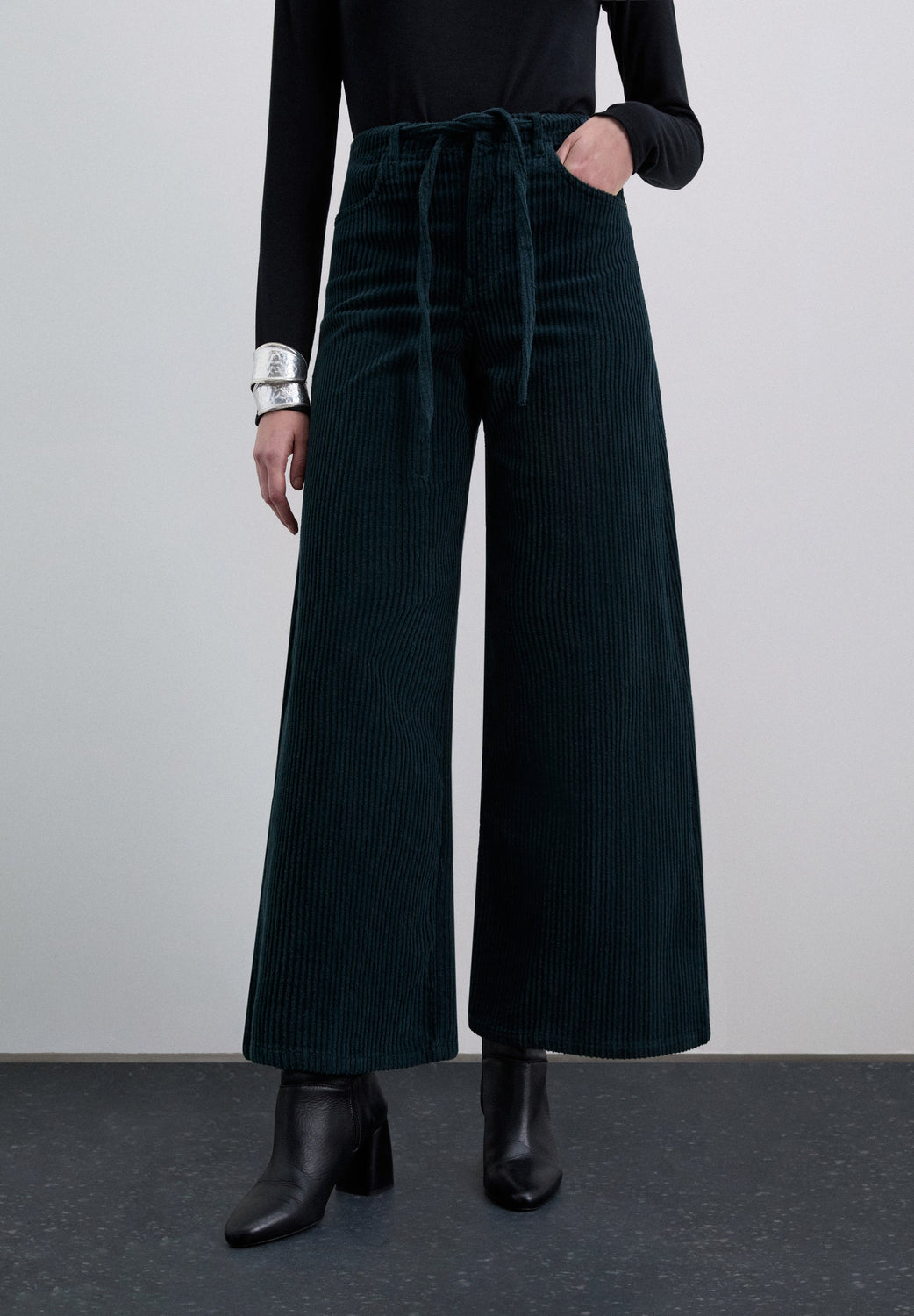Trousers made of BCI cotton. Full length. Corduroy effect. Matching drawstring waist. Side and back pockets.
