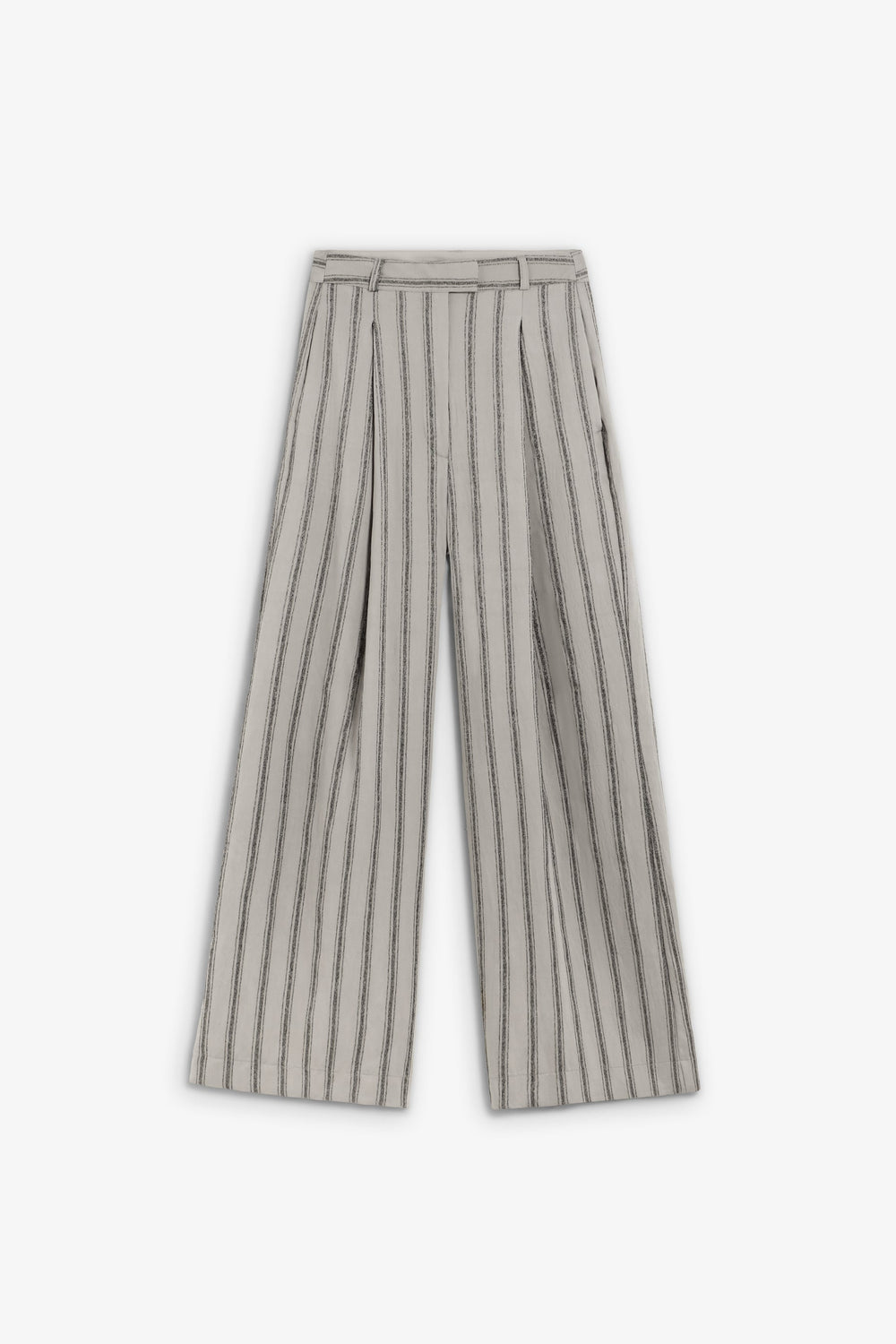 Pinstripe print trousers. Zip and top button fastening. Belt loops.
