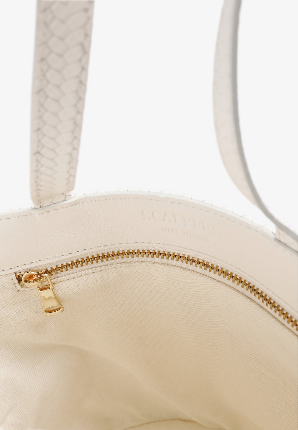 Bucket bag made of braided 100% leather. Inner lining with zipped pocket. Rubberised logo detail on the front. Short strap.