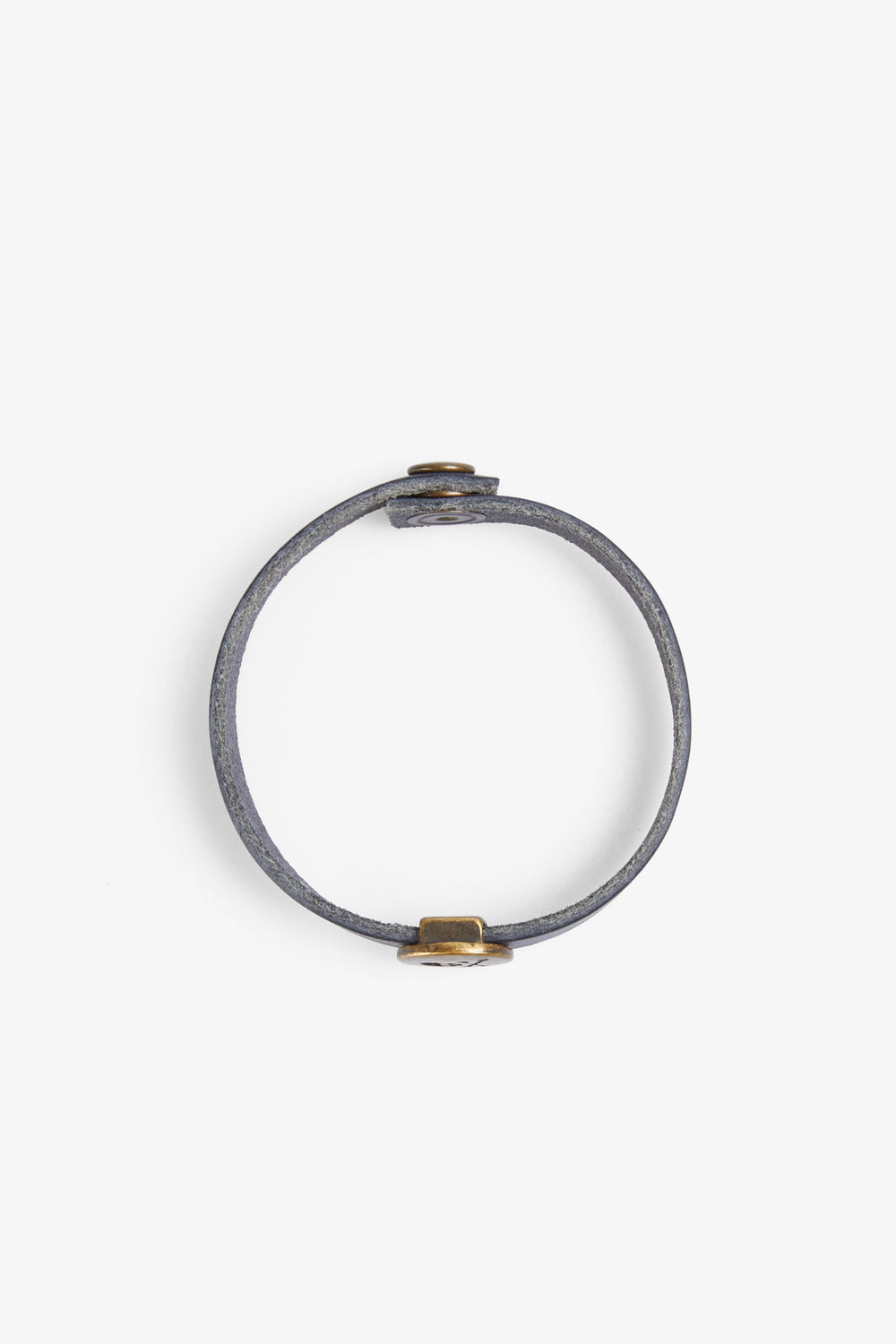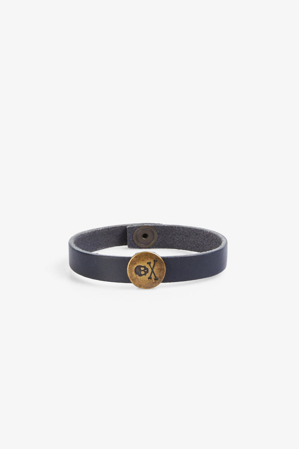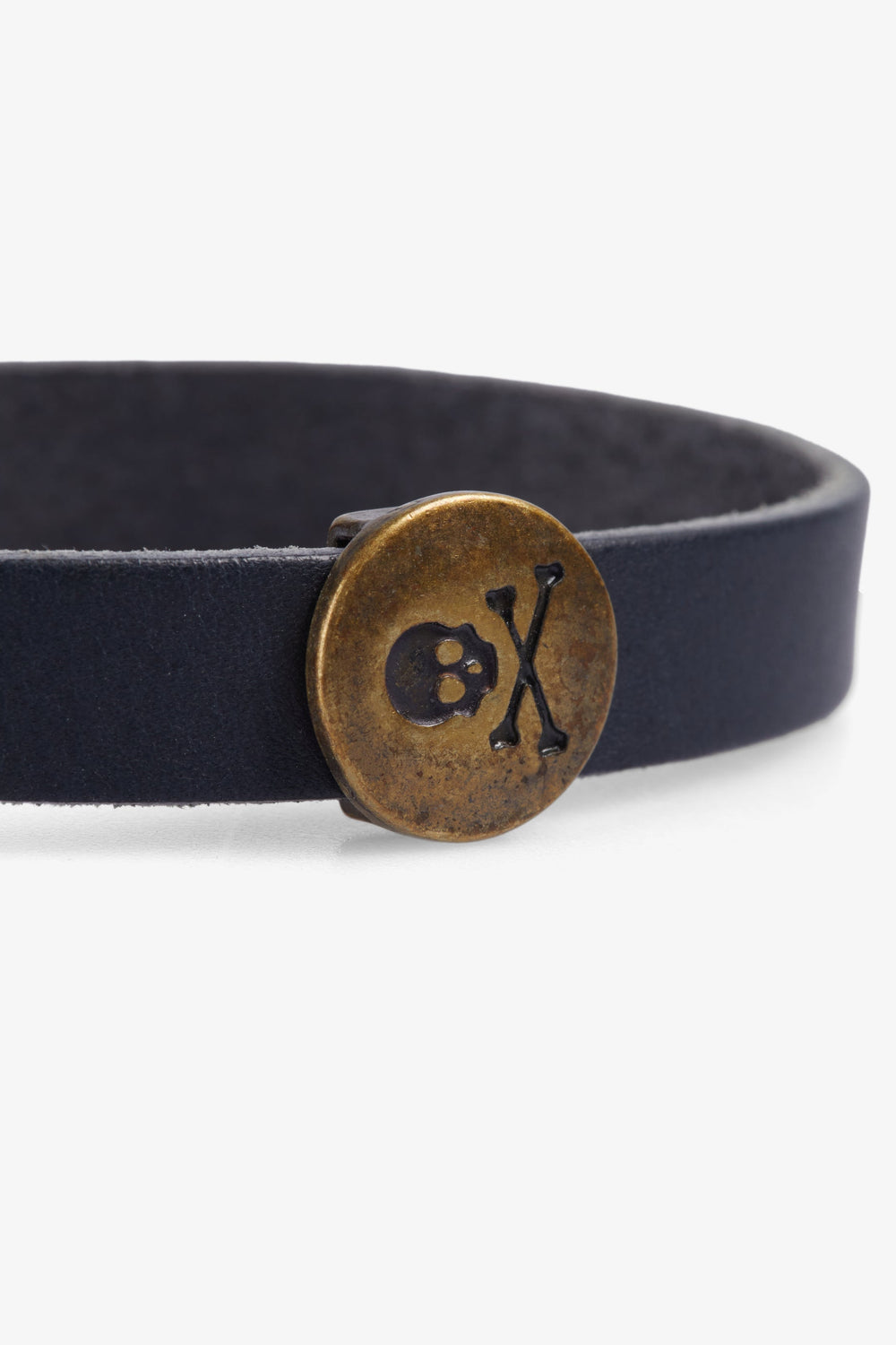 Bracelet made of 100% leather. Metal appliqué detail with skull. Snap button closure.