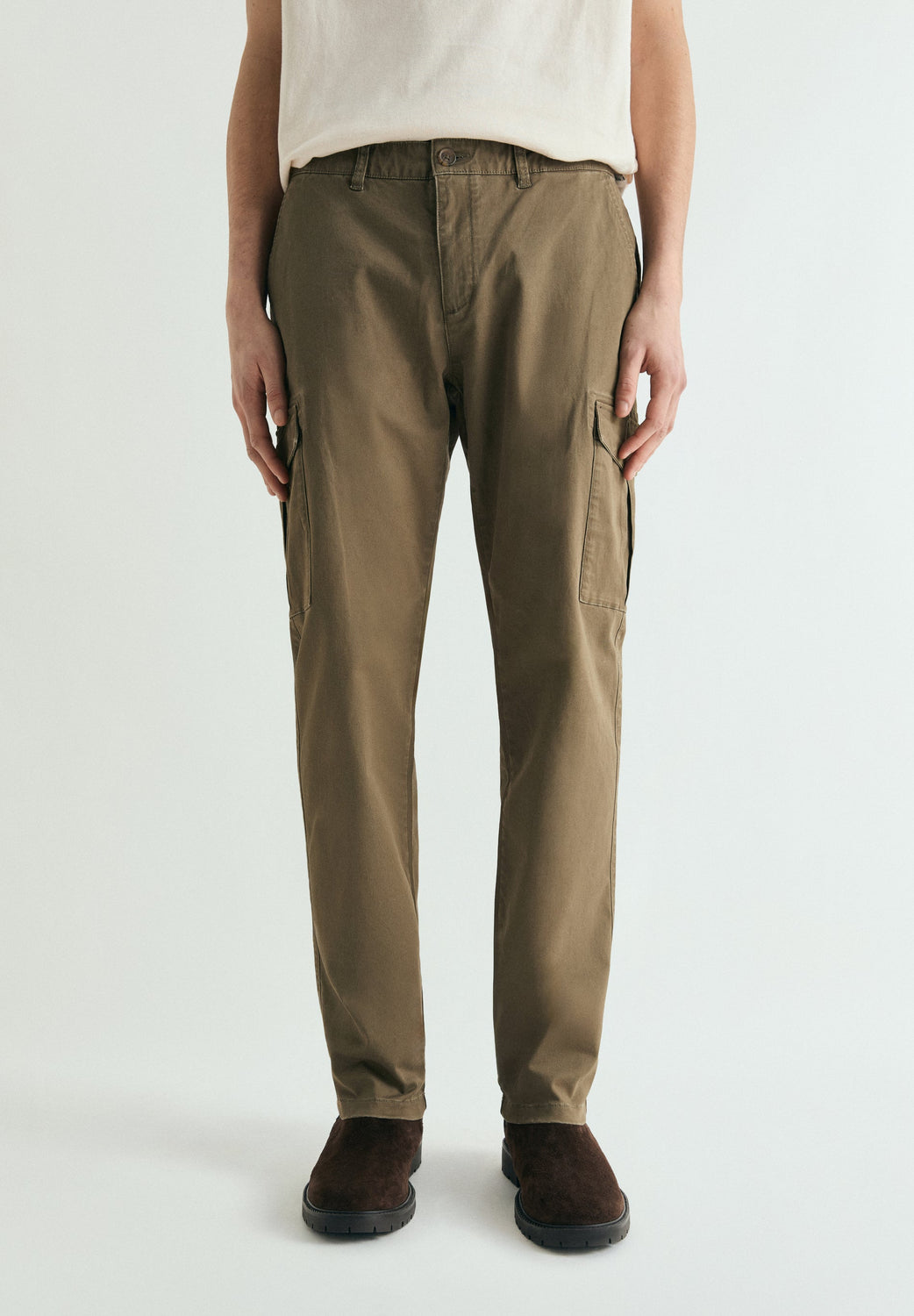 Cargo trousers made of cotton. Slim fit. Two side pockets with flap and reinforced placket. Welt pocket at the back. Front button and zip fastening.