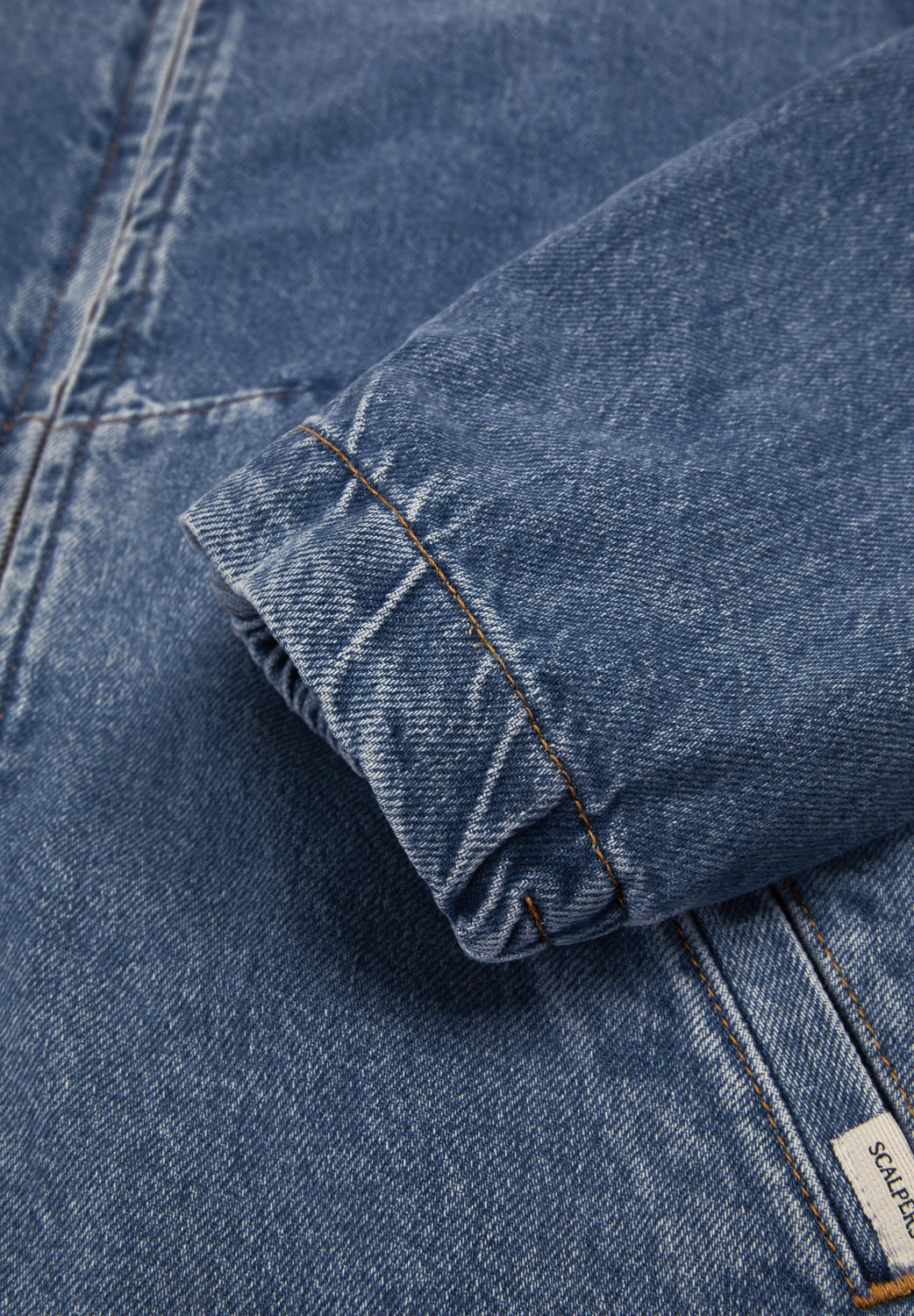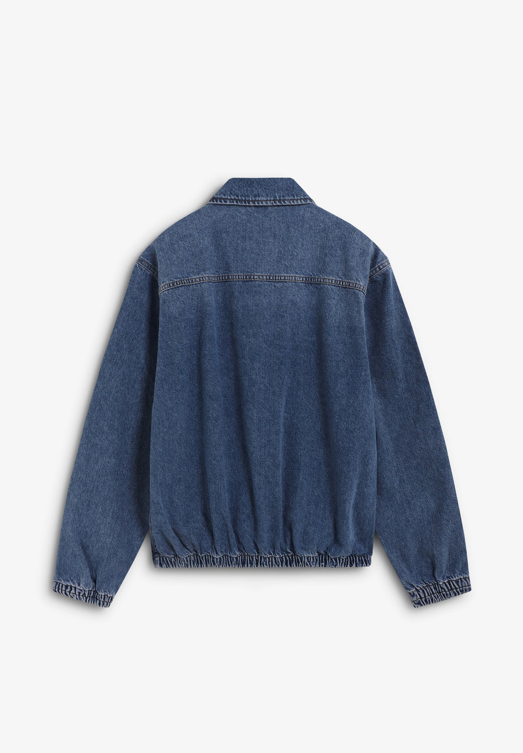Denim bomber jacket made of 100% cotton. Front pockets with label detail. Visible seams at front. Front double slider zip fastening.