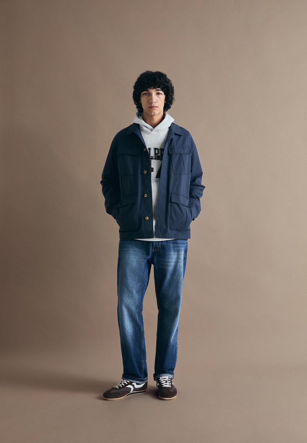 Jacket made of a cotton blend. Four pockets. Military style. Front button fastening. Angled flap pockets and shirt collar.
