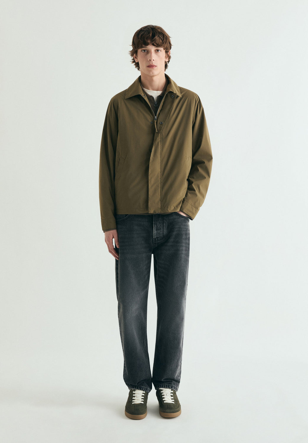 Jacket made of a technical fabric. Concealed zip and press-stud fastening. Two side pockets. Inner pocket. Adjustable cuffs. Slightly stretchy hem.