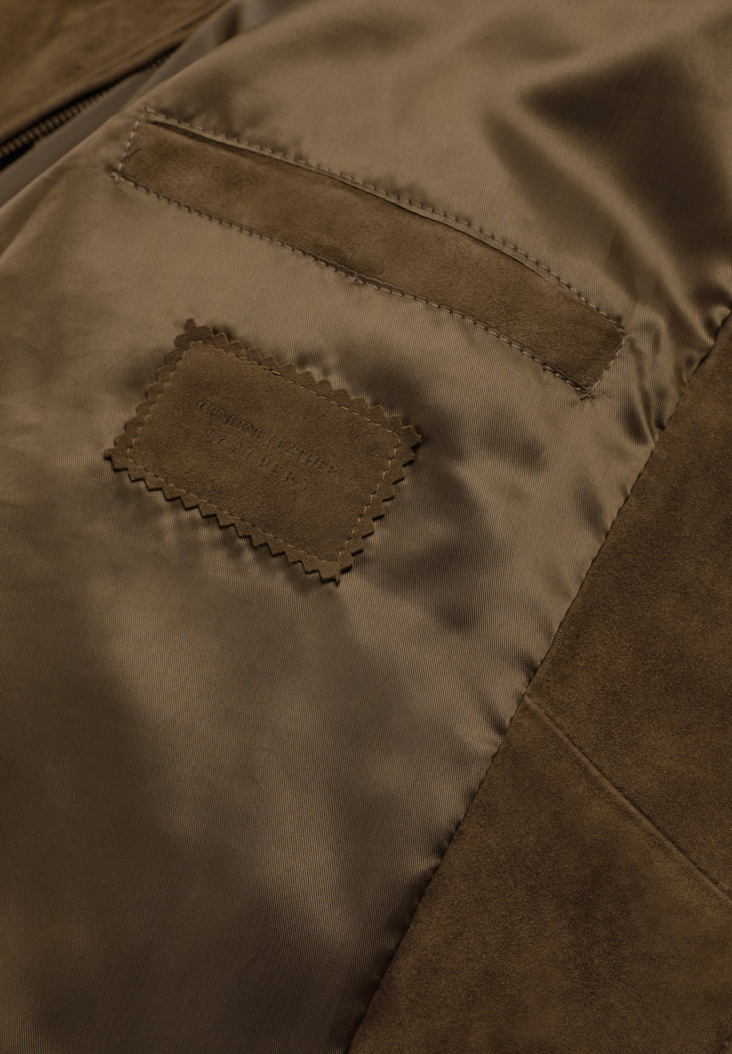 Bomber-style jacket made of 100% suede. Two pockets with press-stud fastening. Double slider zip fastening. Ribbed trim.
