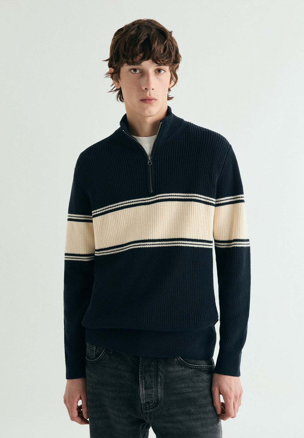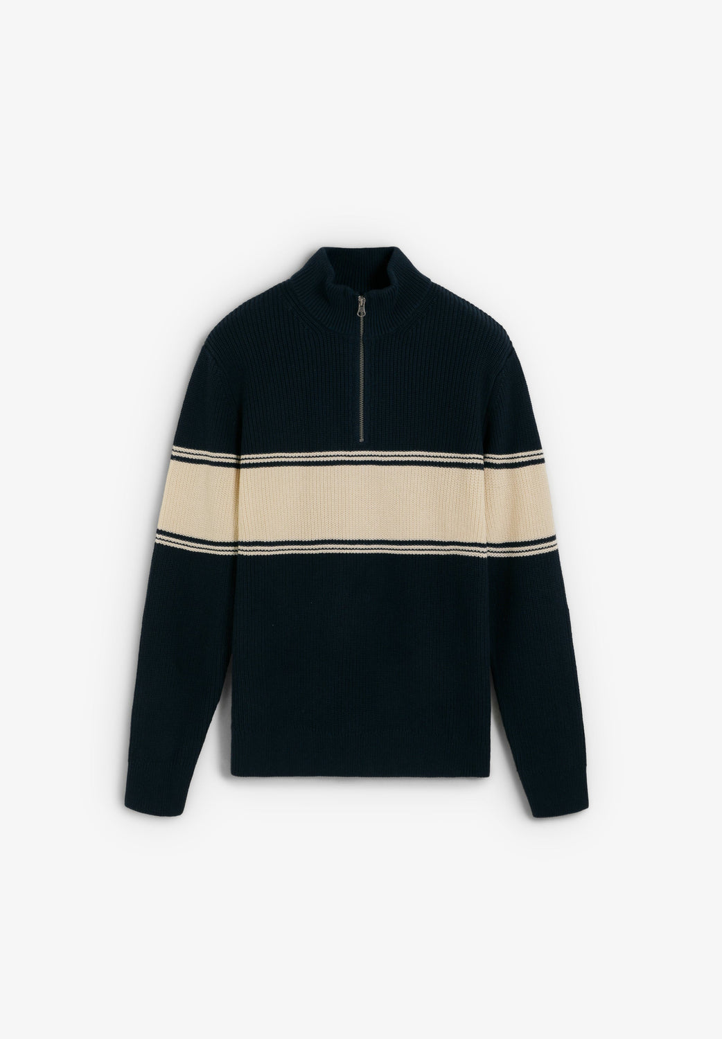Knit sweater made of 100% BCI cotton. High neck with half-zip. Contrast woven stripe on front and sleeves. Ribbed trim.