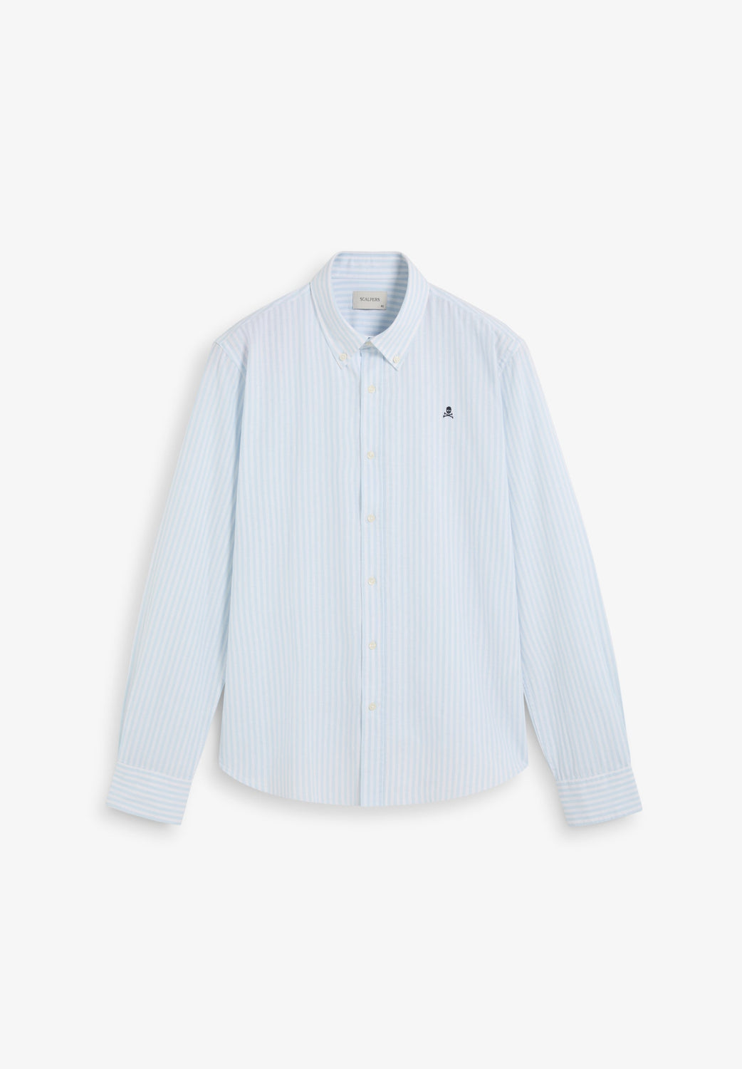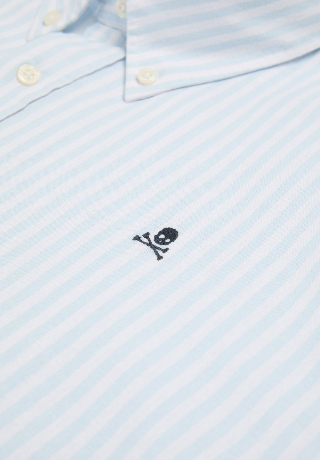Oxford shirt made of a cotton and linen blend. Stripe print. Front button fastening. Contrast embroidered skull on the chest.