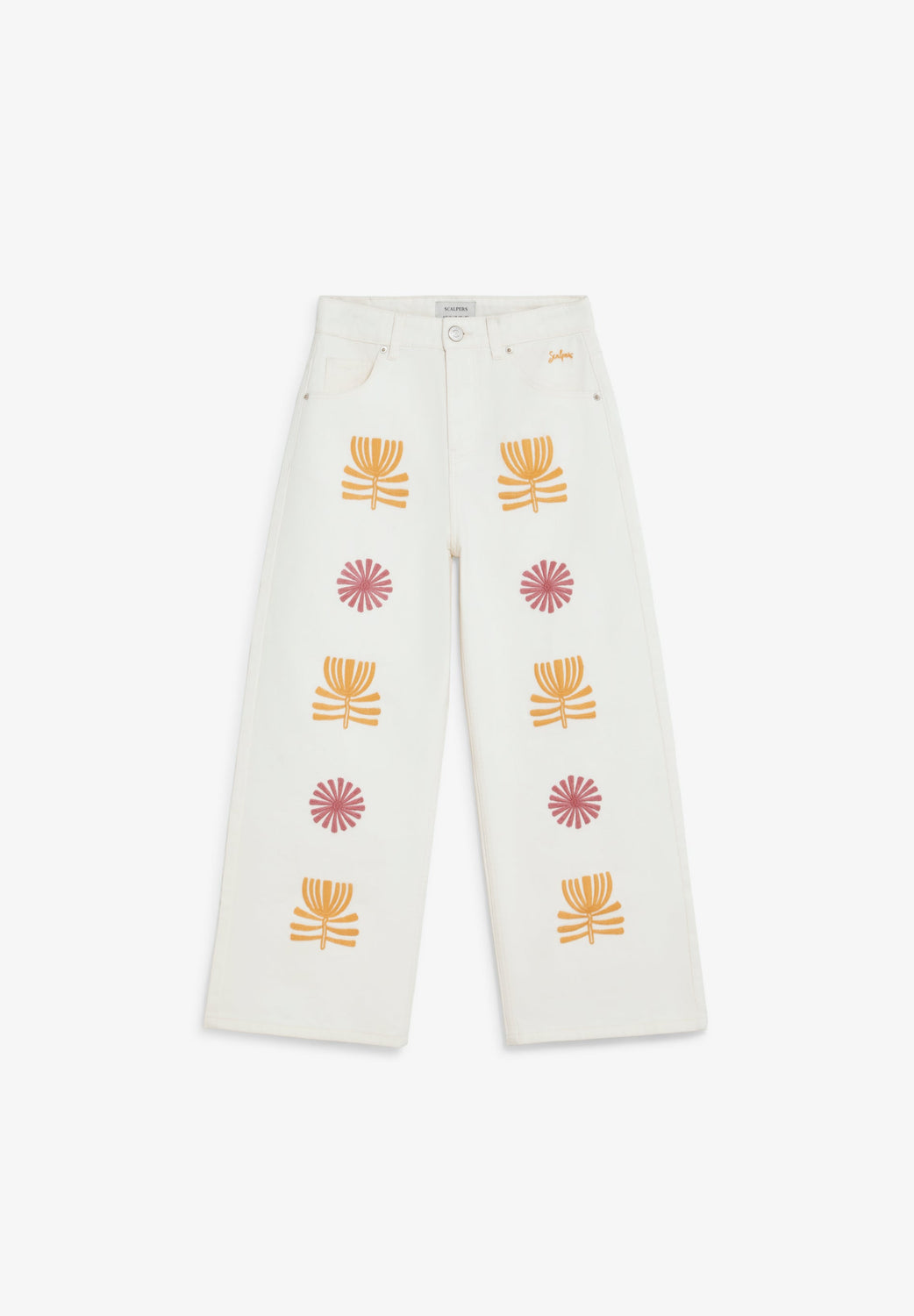 Culotte jeans made of 100% BCI cotton. Embroidered details at the front. Belt loops at the waist and zip and button fastening.