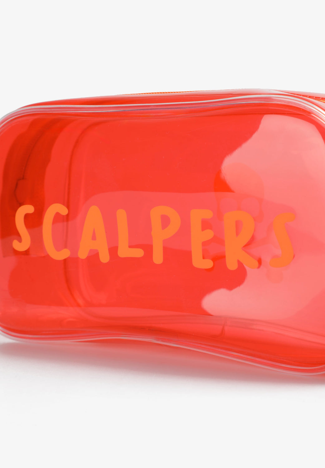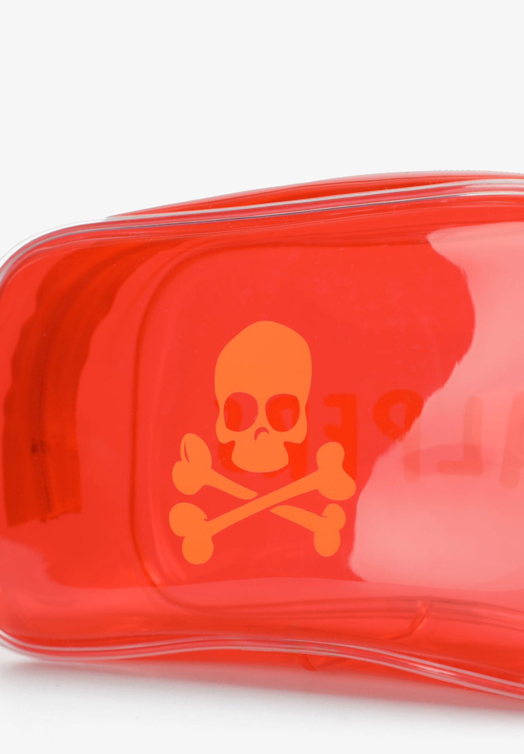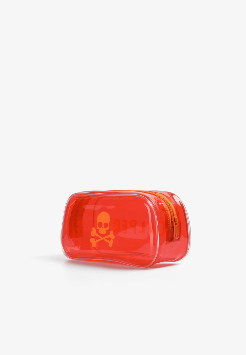 Transparent toiletry bag with zip fastening. Side print with skull and logo. Includes transparent bottles for liquids.