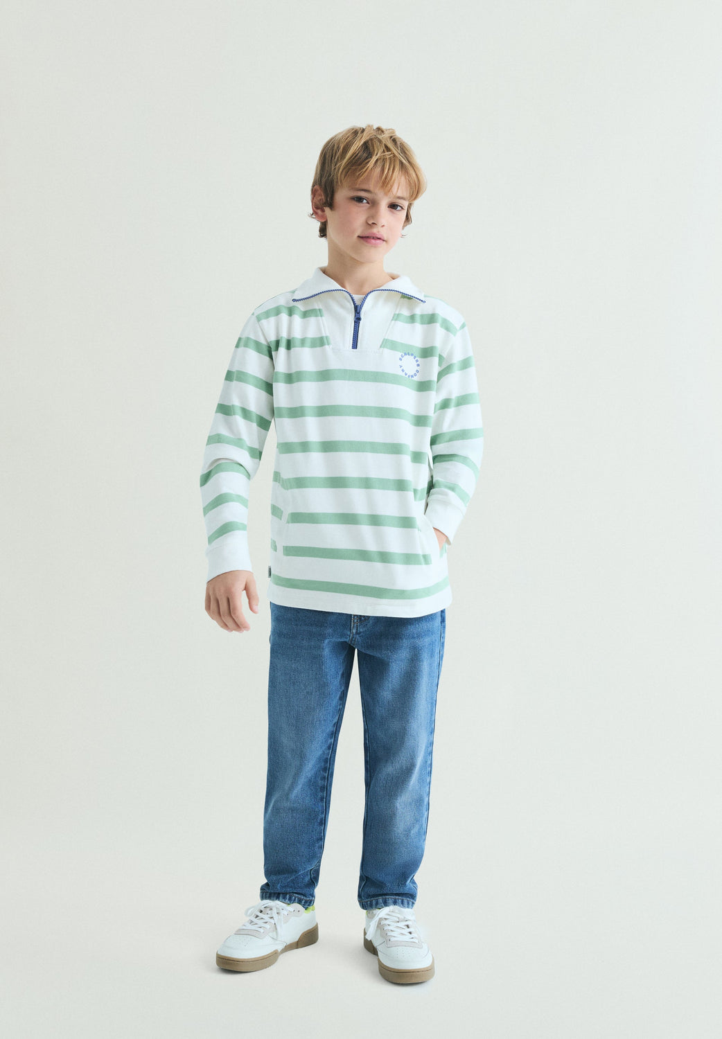 Striped sweatshirt made of 100% BCI cotton with polo shirt collar. Front zip fastening. Pouch pocket. Logo detail on chest and printed skull logo on back. Ribbed cuffs and hem.