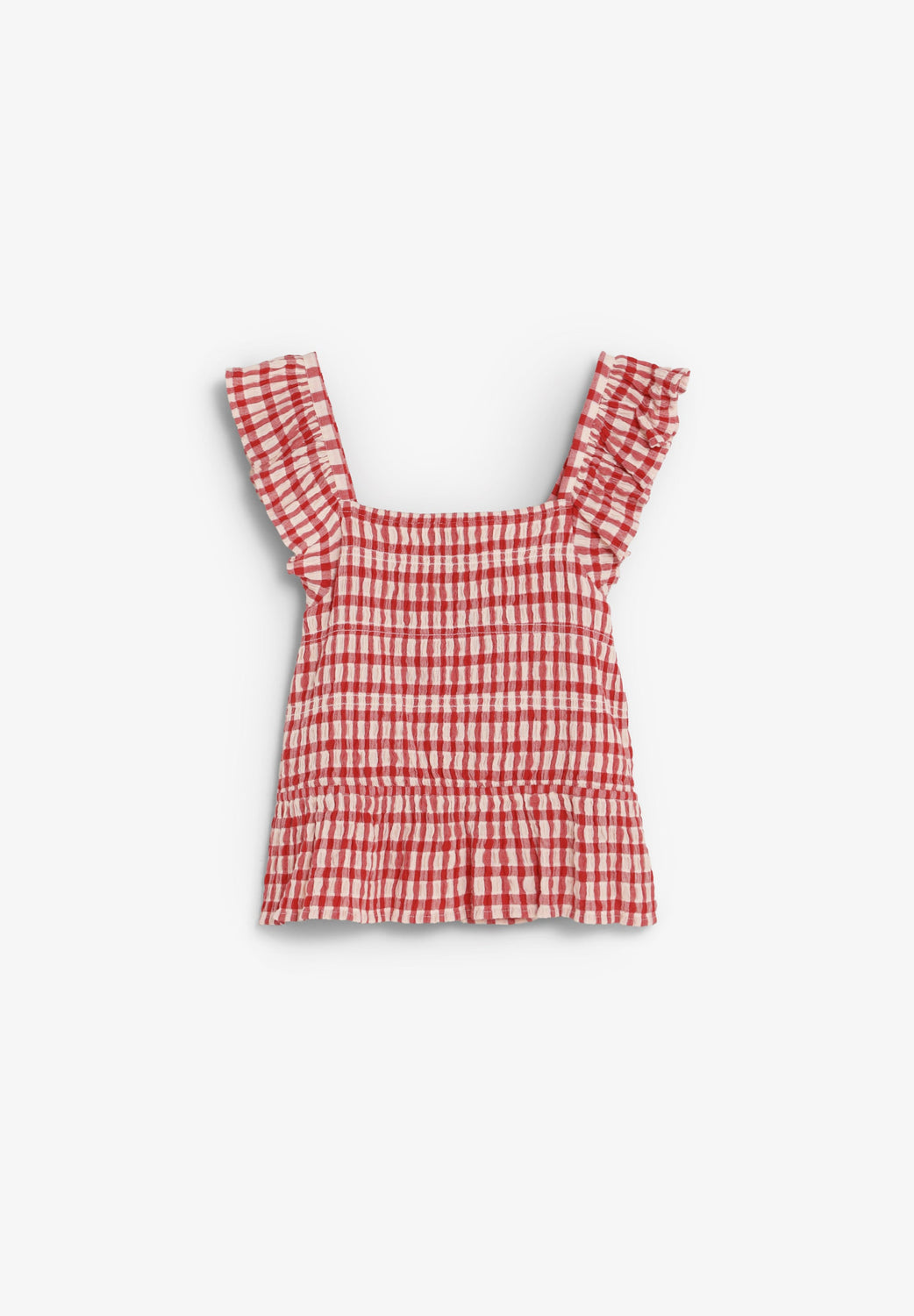 Top made of 100% BCI cotton. Regular Fit. Gingham print. Straps with ruffles. Smocked detail. Ruffle on the hem.