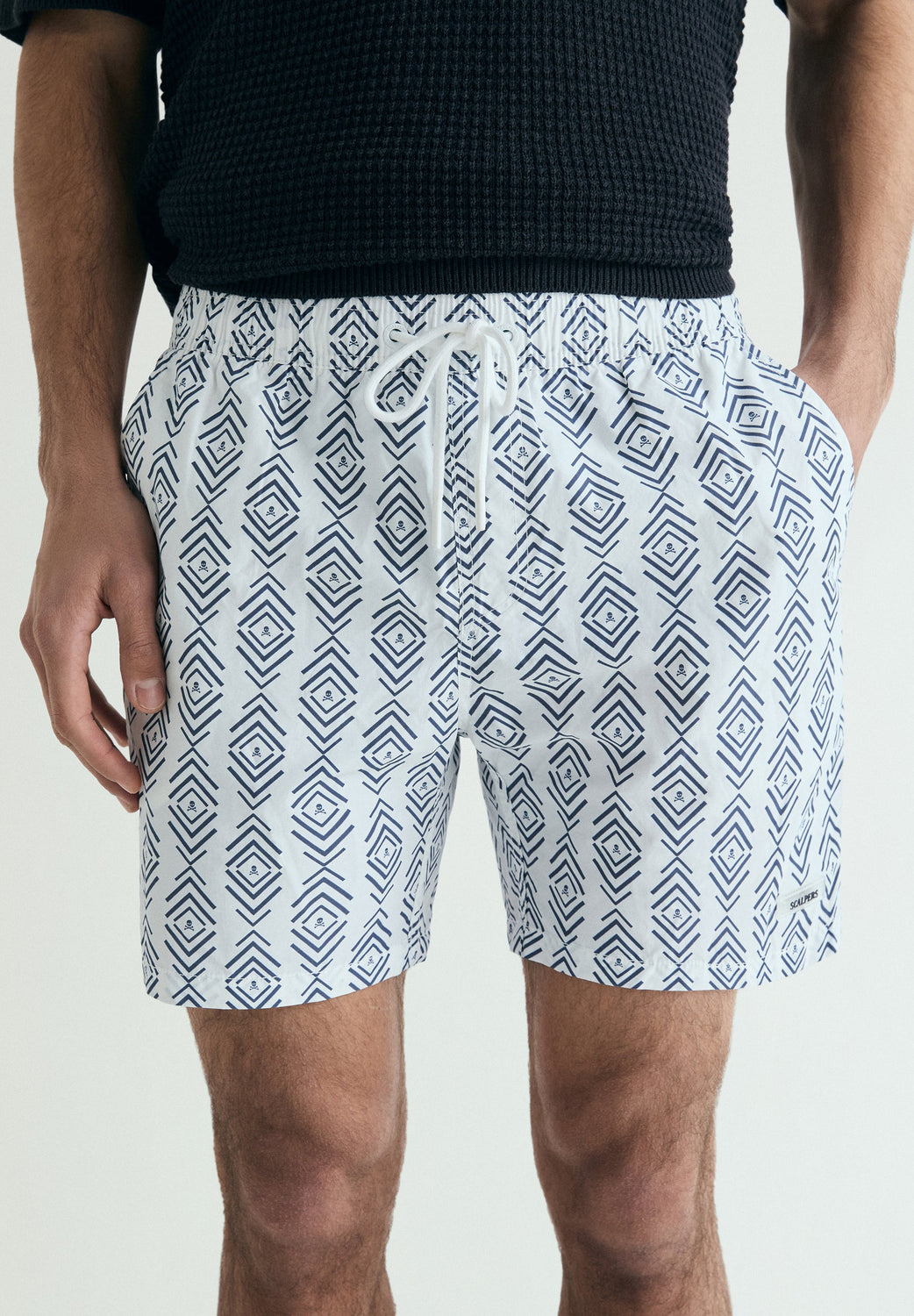 Swimming trunks with elasticated waistband and drawstring. Side pockets. Contrast print. Back pocket. Logo patch detail on the hem.