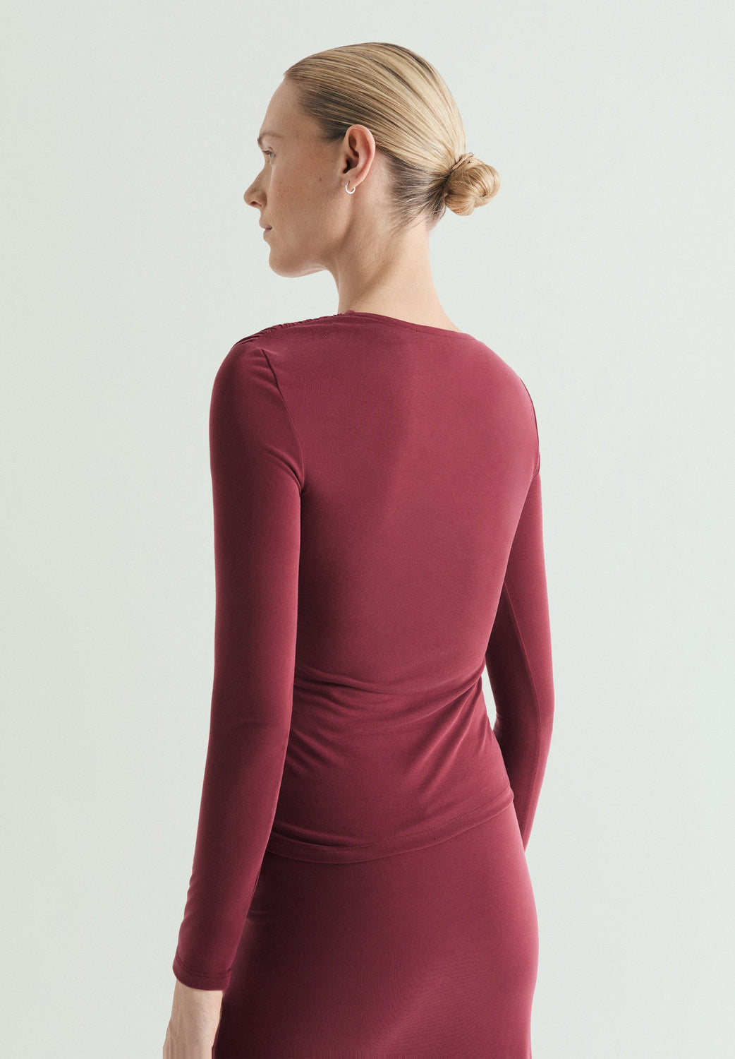 T-shirt made of cupro with a fluid drop. Slim fit, asymmetrical neckline, gathered details on shoulder and waist. Long sleeves.
