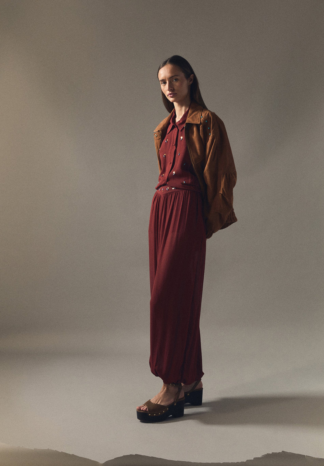 Balloon trousers made of a fluid fabric with appliqué details at the waist and adjustable ankle ties. Regular fit, elasticated back waistband.