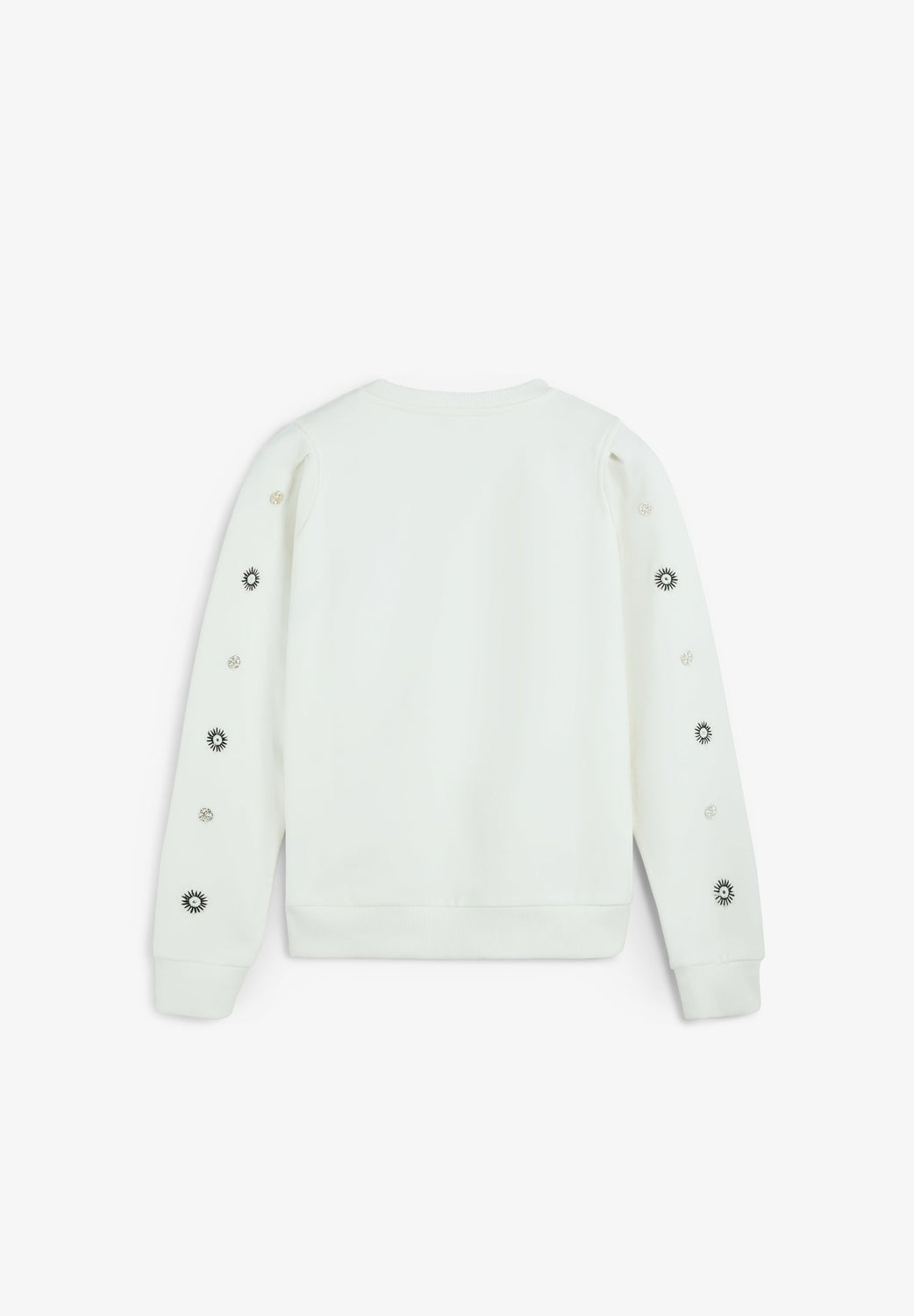 Sweatshirt made of 100% cotton. Decorative embroidery and appliqué details on the sleeves. Round neck, long sleeves and ribbed trim on collar, cuffs and waist.