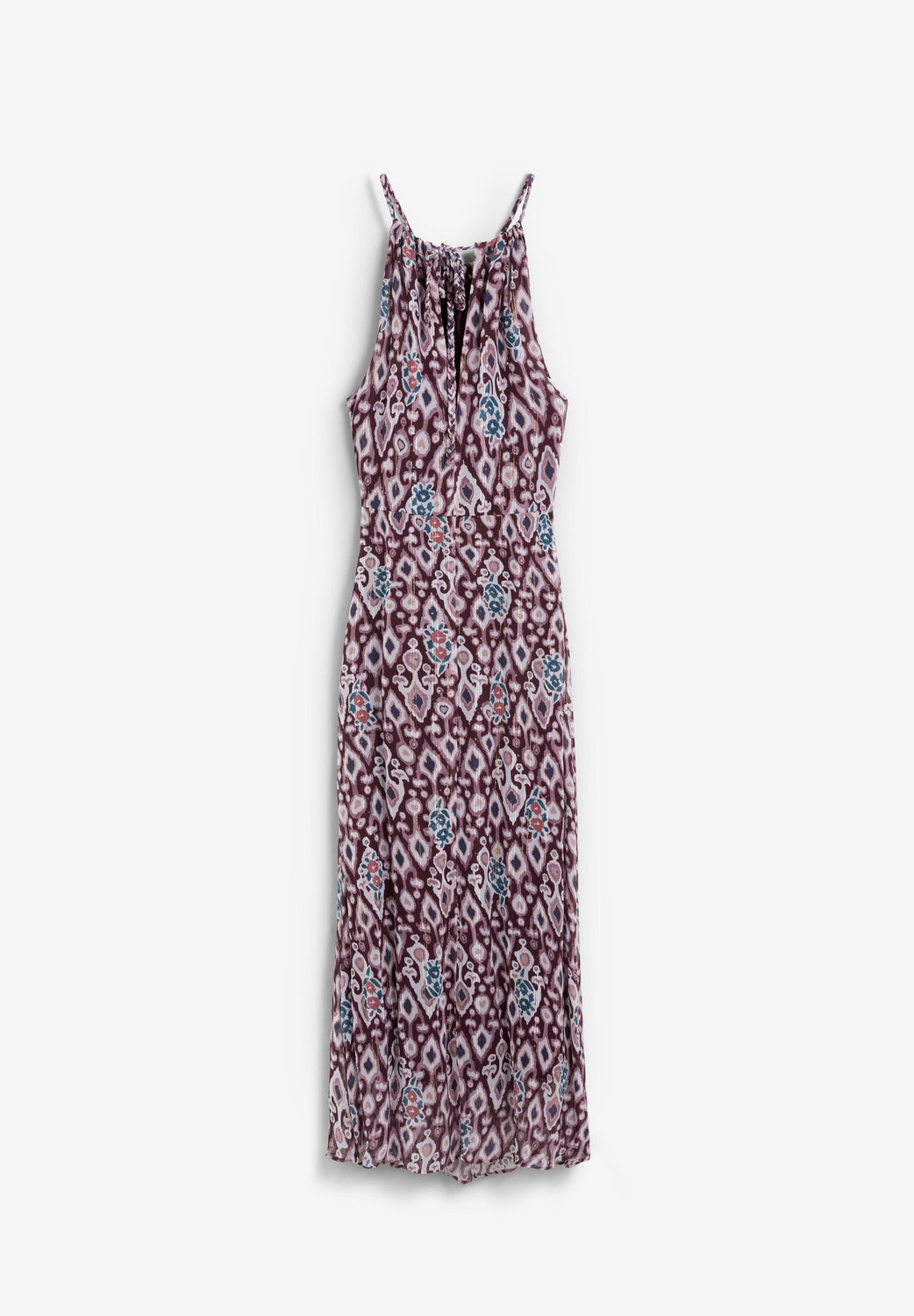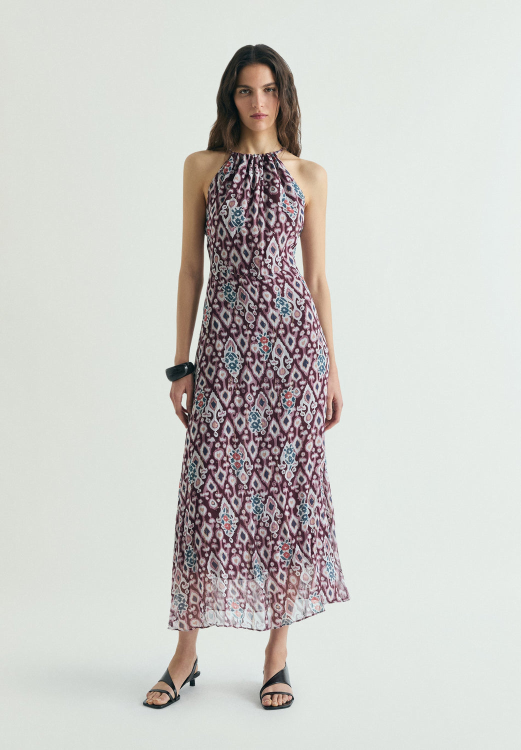 Dress made of flowing fabric with metallic thread. Halter neck, front opening on the neckline. Midi length. Multicoloured print. Adjustable braided lacing at the back. Concealed side zip fastening.