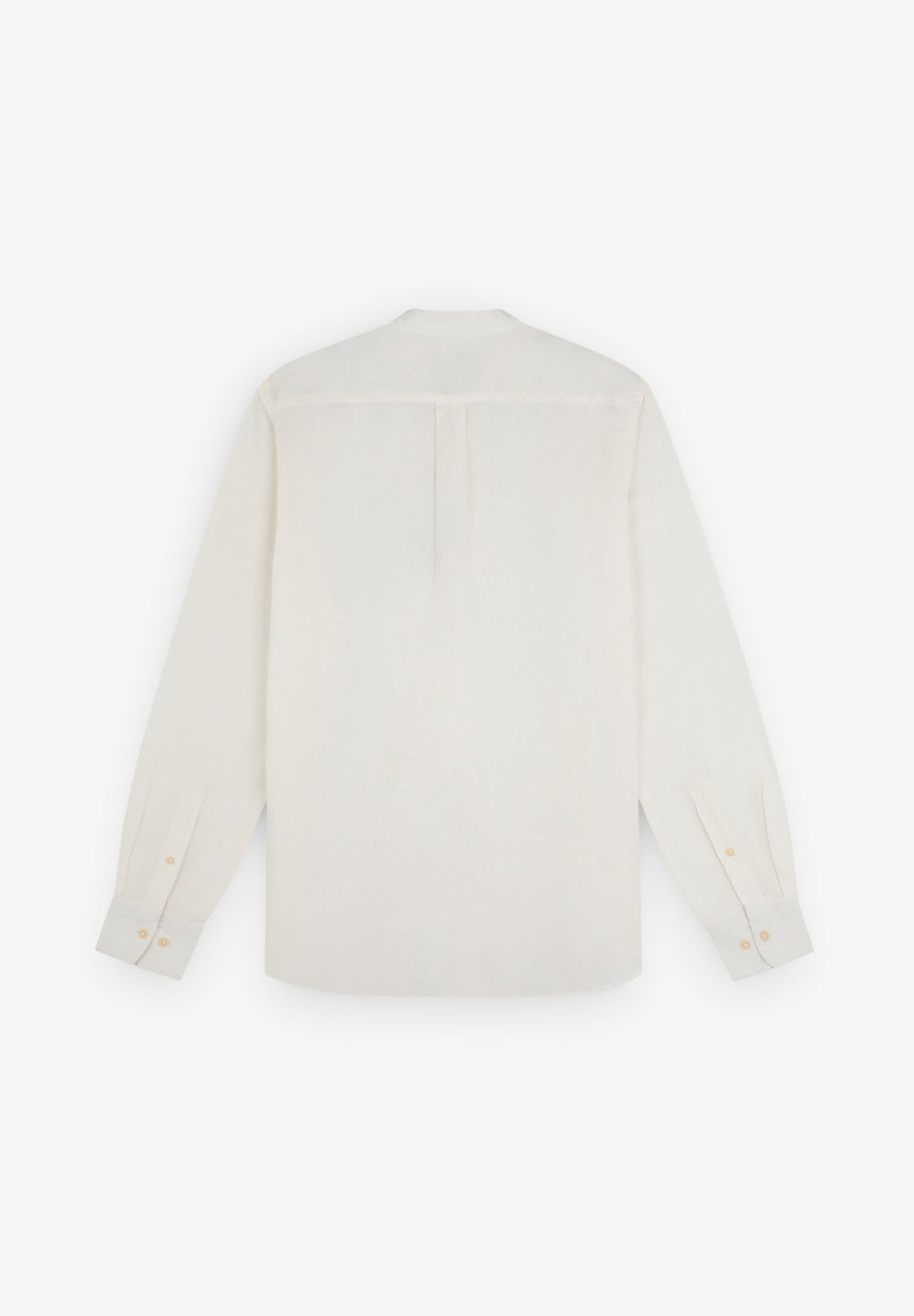 T-shirt made of a linen and cotton blend. Stand-up collar and long sleeves with buttoned cuffs. Front button fastening.