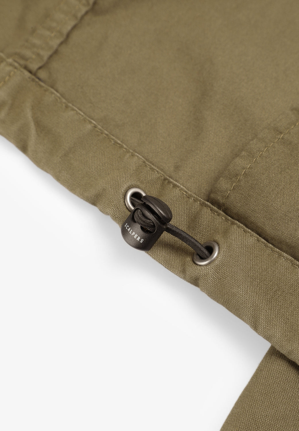 Military-style jacket made of 100% cotton. Regular fit, collar with detachable hood with zip. Double slider zip and snap button fastening. Long sleeves with snap button fastening on cuffs with tabs at the back.