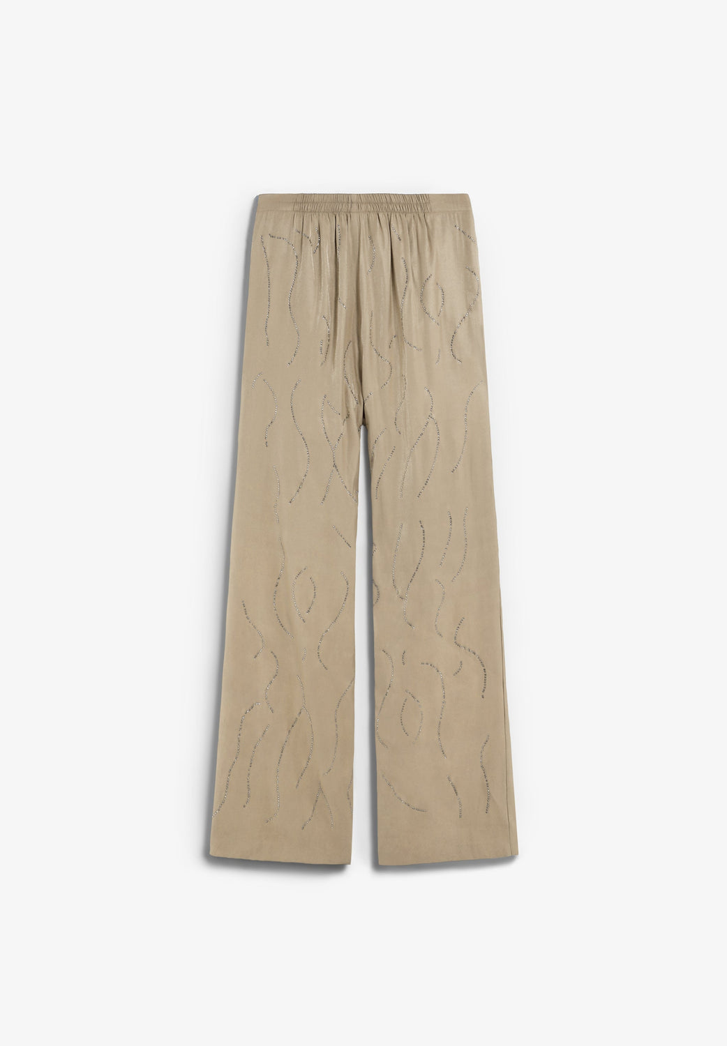 Trousers with rhinestone detailing. Elasticated waistband. Flowing fabric with satin finish. Side pockets.