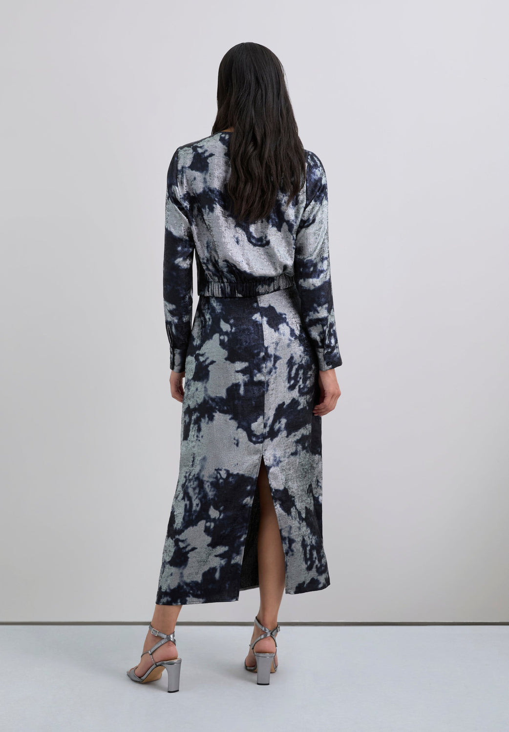 Flowing fabric skirt with tie-dye print and metallic details. Slim fit. Midi. Back vent. Concealed side zip fastening.