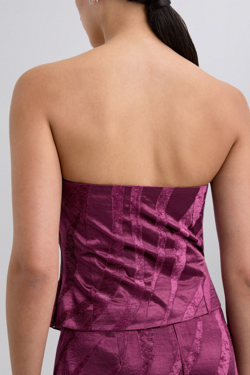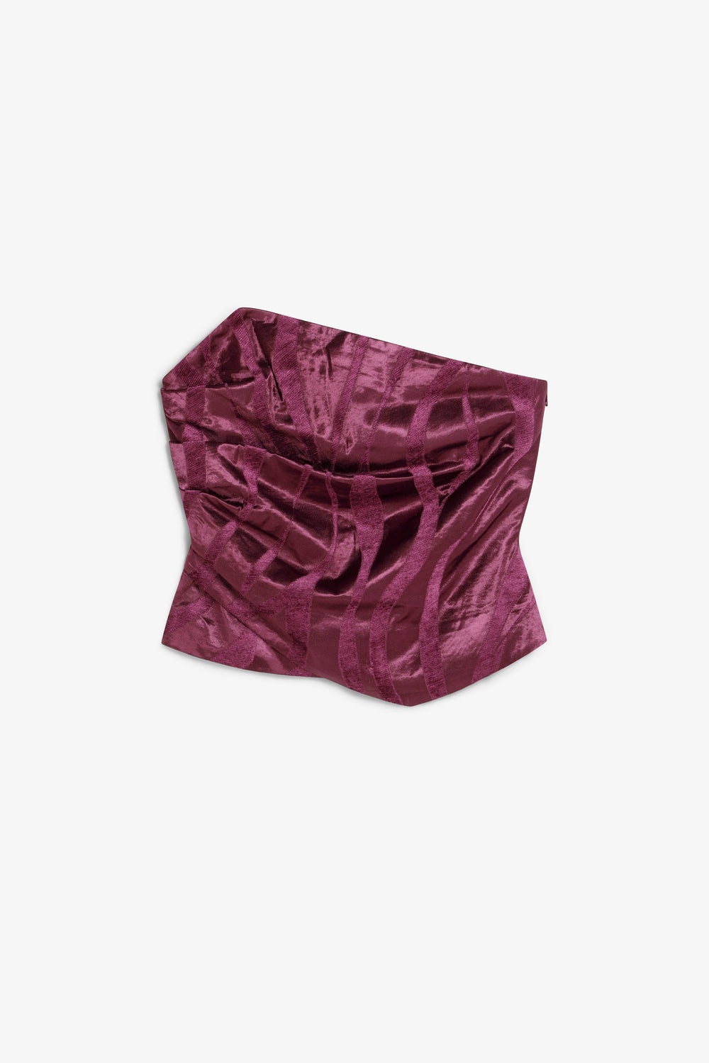 Bandeau top with asymmetric neckline and hem. Jacquard print. Double layer. Pleats on one side.