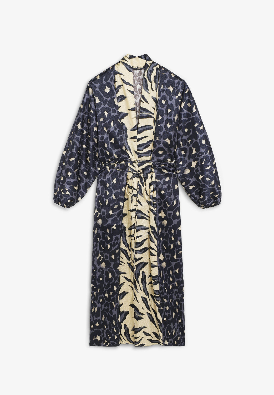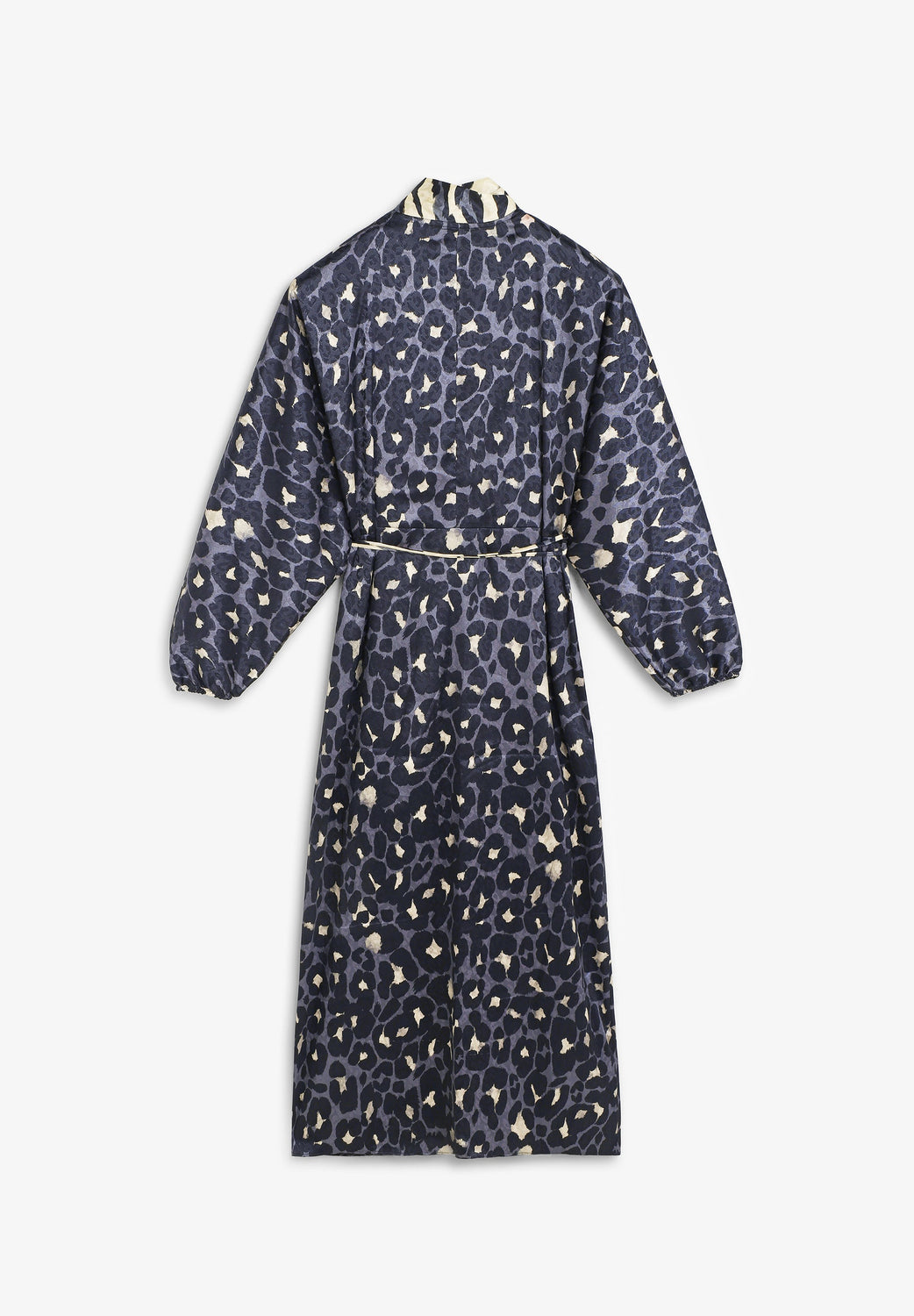 Long dress with animal print. Long, slightly puffed sleeves with gathered cuffs. Adjustable tie front. V-neck.