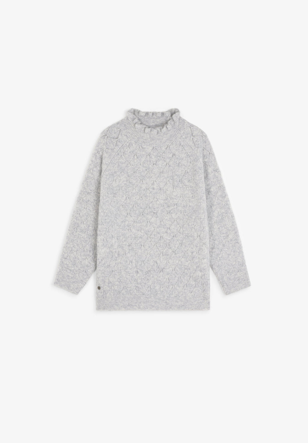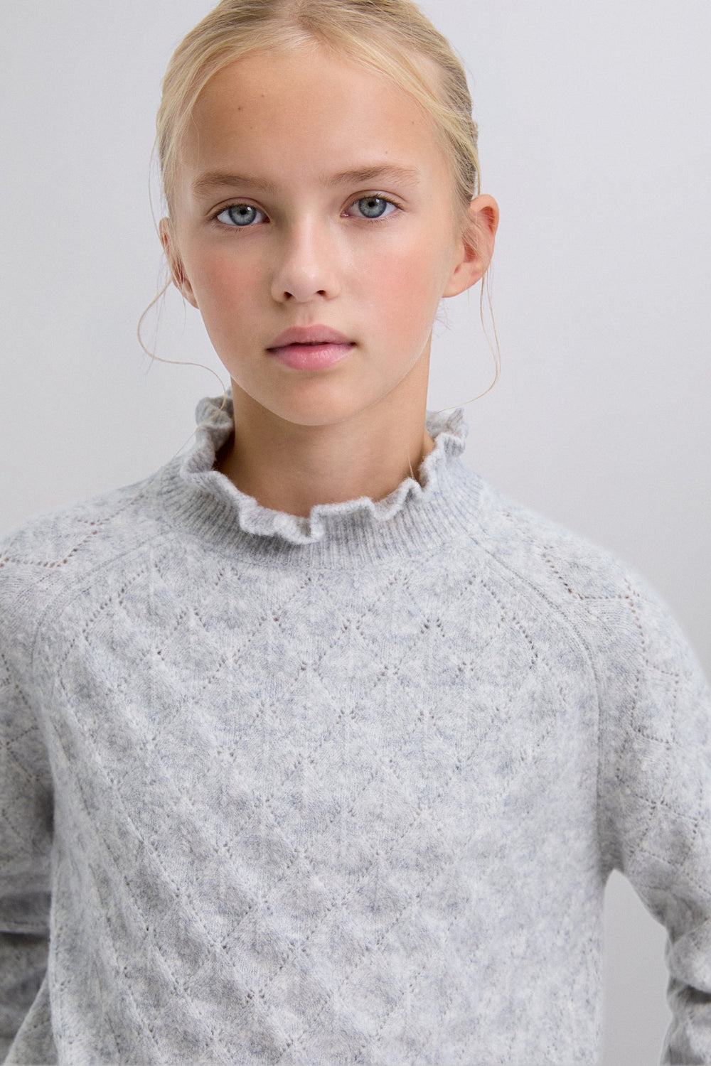 Knit sweater made of a merino wool blend. High neck with ruffles. Long sleeves with ribbed cuffs. Perforated diamond pattern.