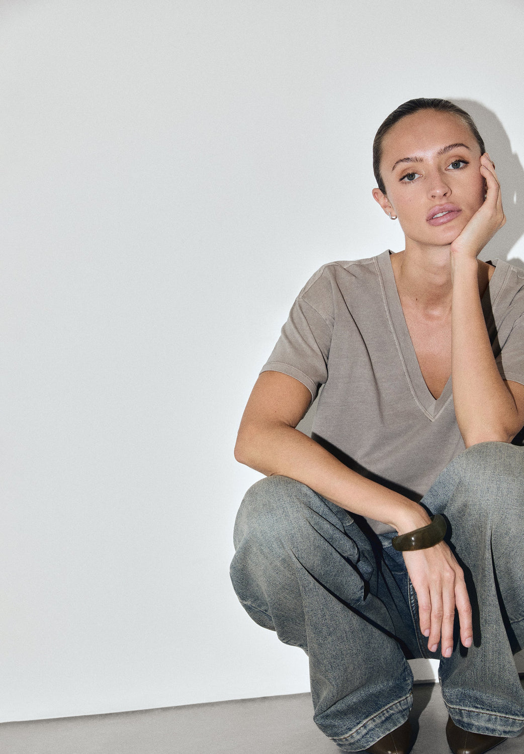 Basic T-shirt made of 100% organic cotton. Regular fit, V-neck and short sleeves. Embroidered logo detail at the lower front.