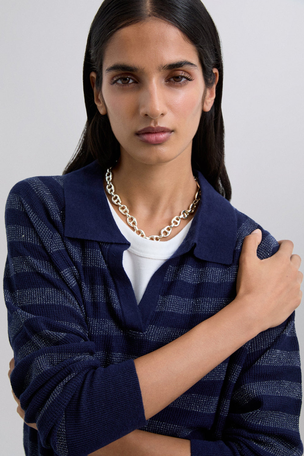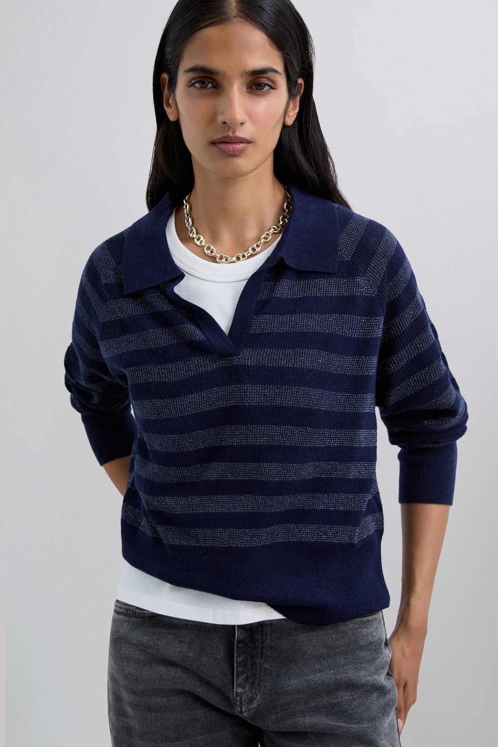 Polo shirt-style sweater made of a wool blend. Regular fit. Striped print with metallic thread. Polo shirt collar. Long sleeves with ribbed cuffs.