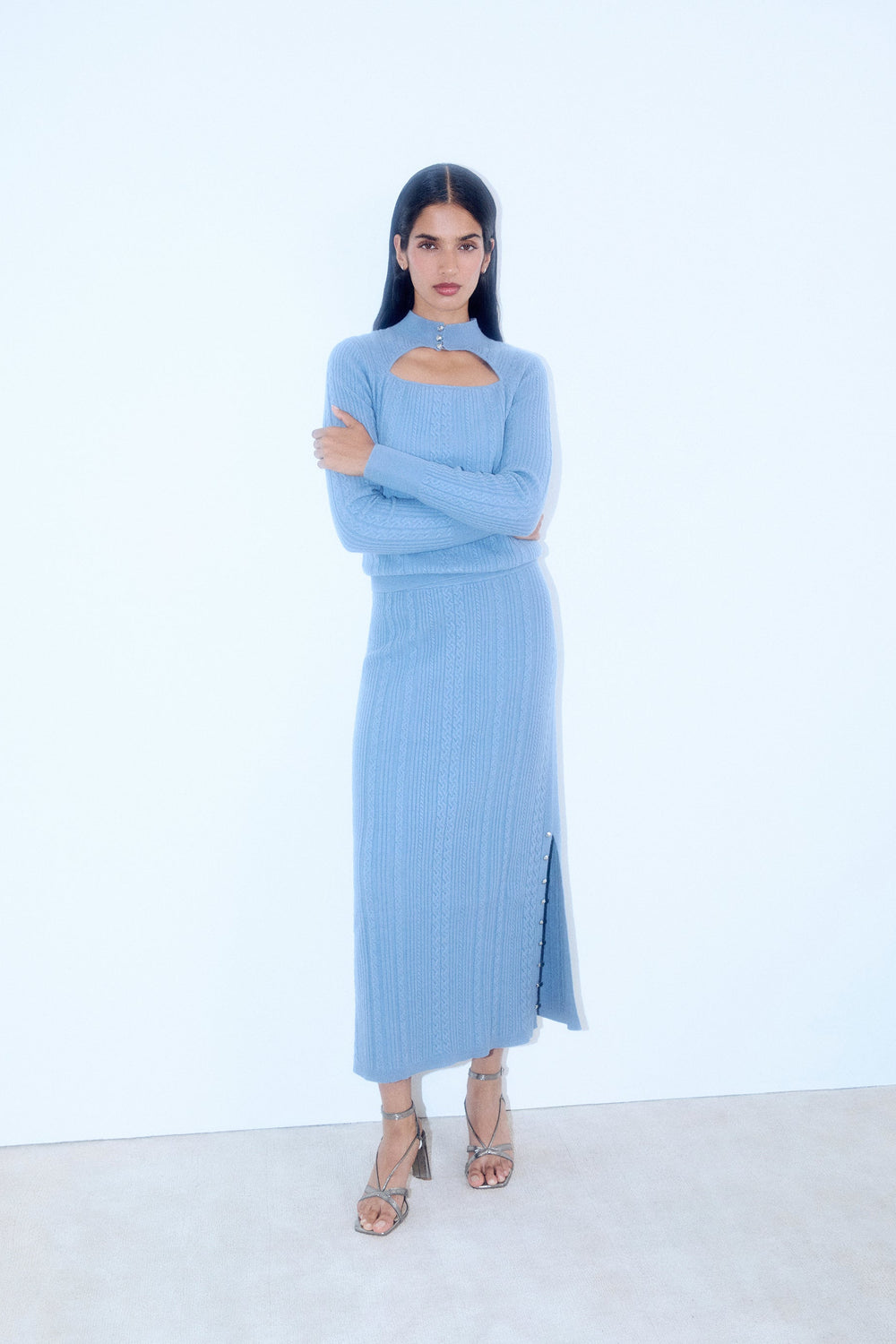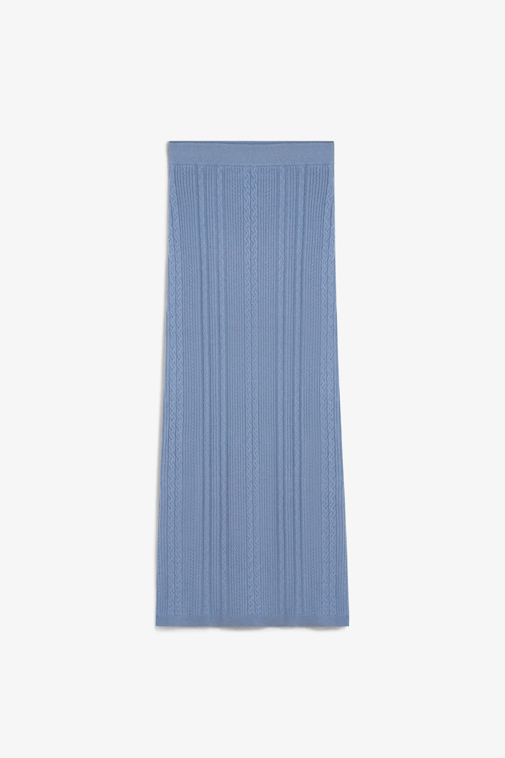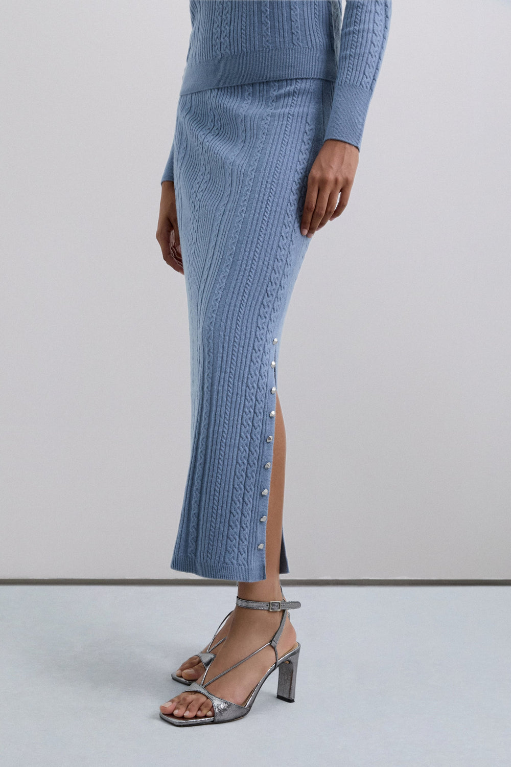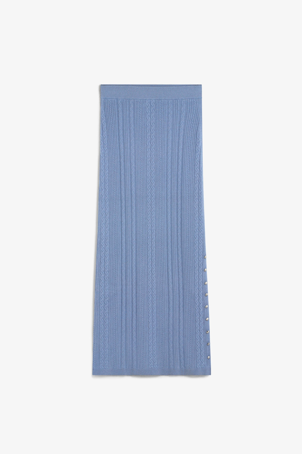 Midi skirt made of a wool blend. Elastic waistband. Slit on the side. Button detail.