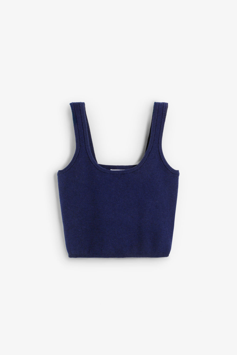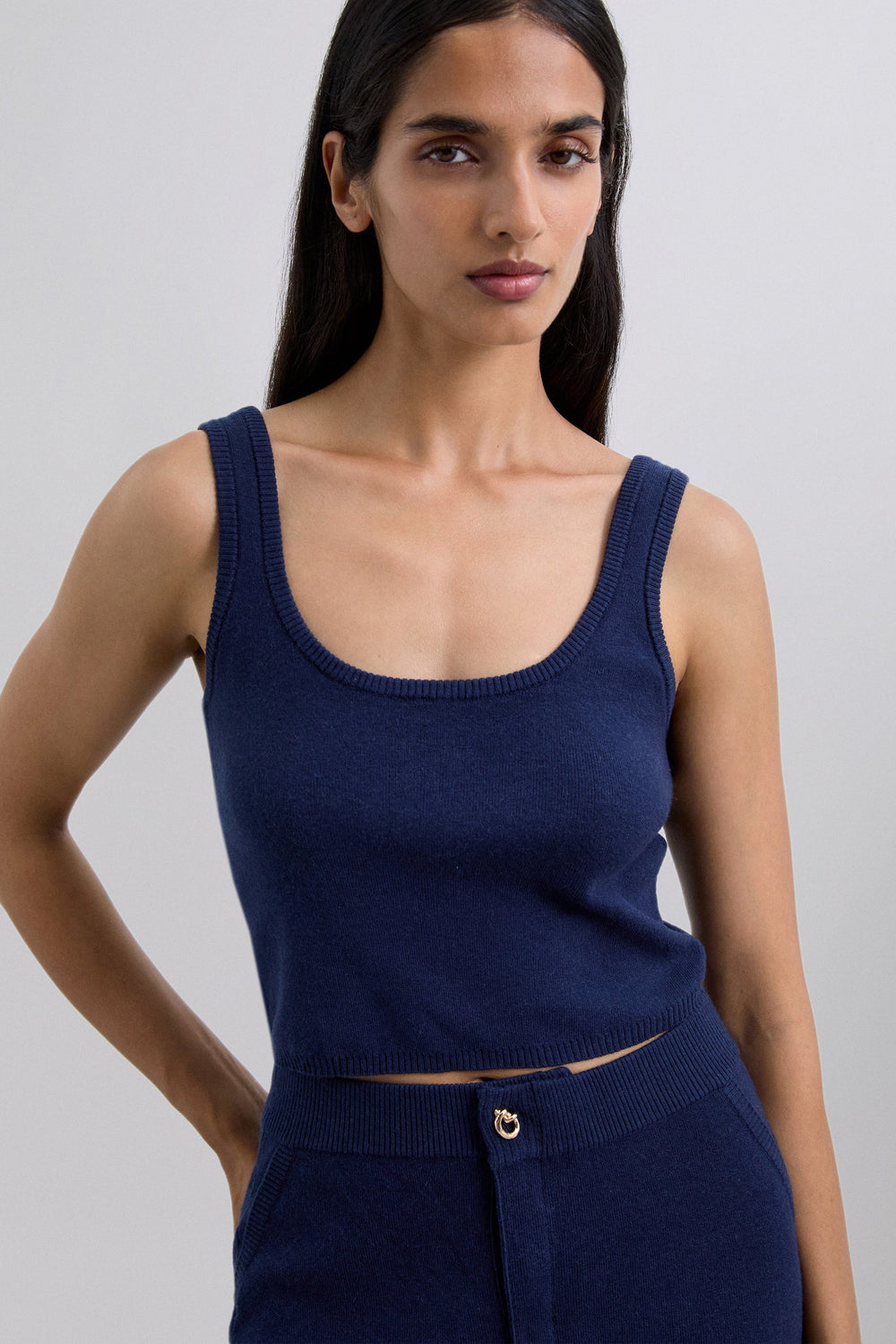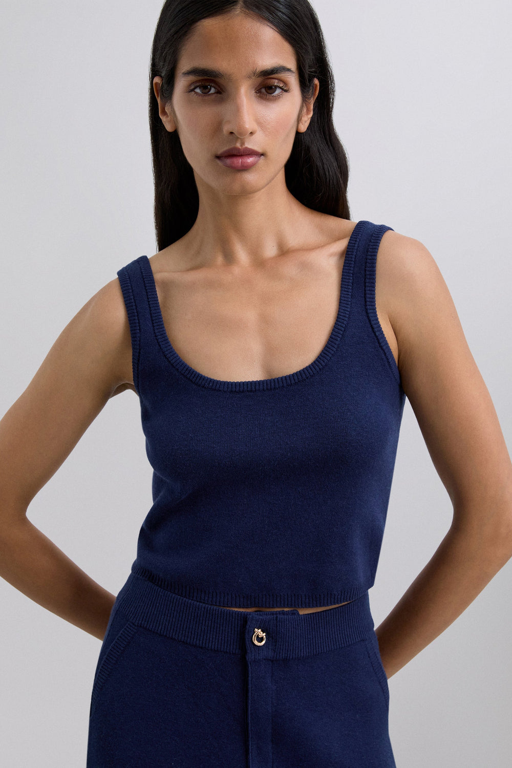 Top made of cotton, viscose and wool blend. Slim fit, cropped, round neck and wide straps. Trim detail on the neckline.