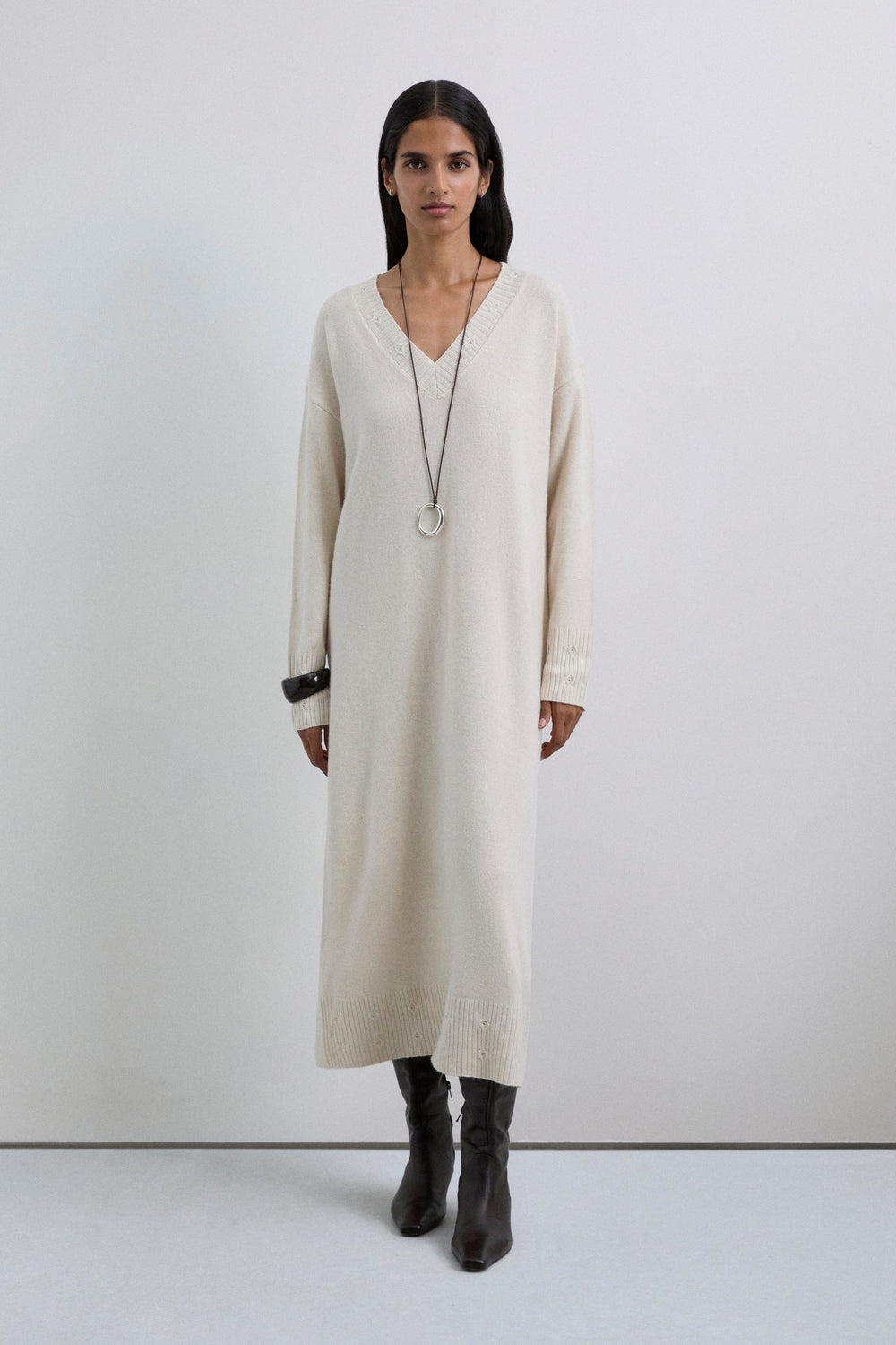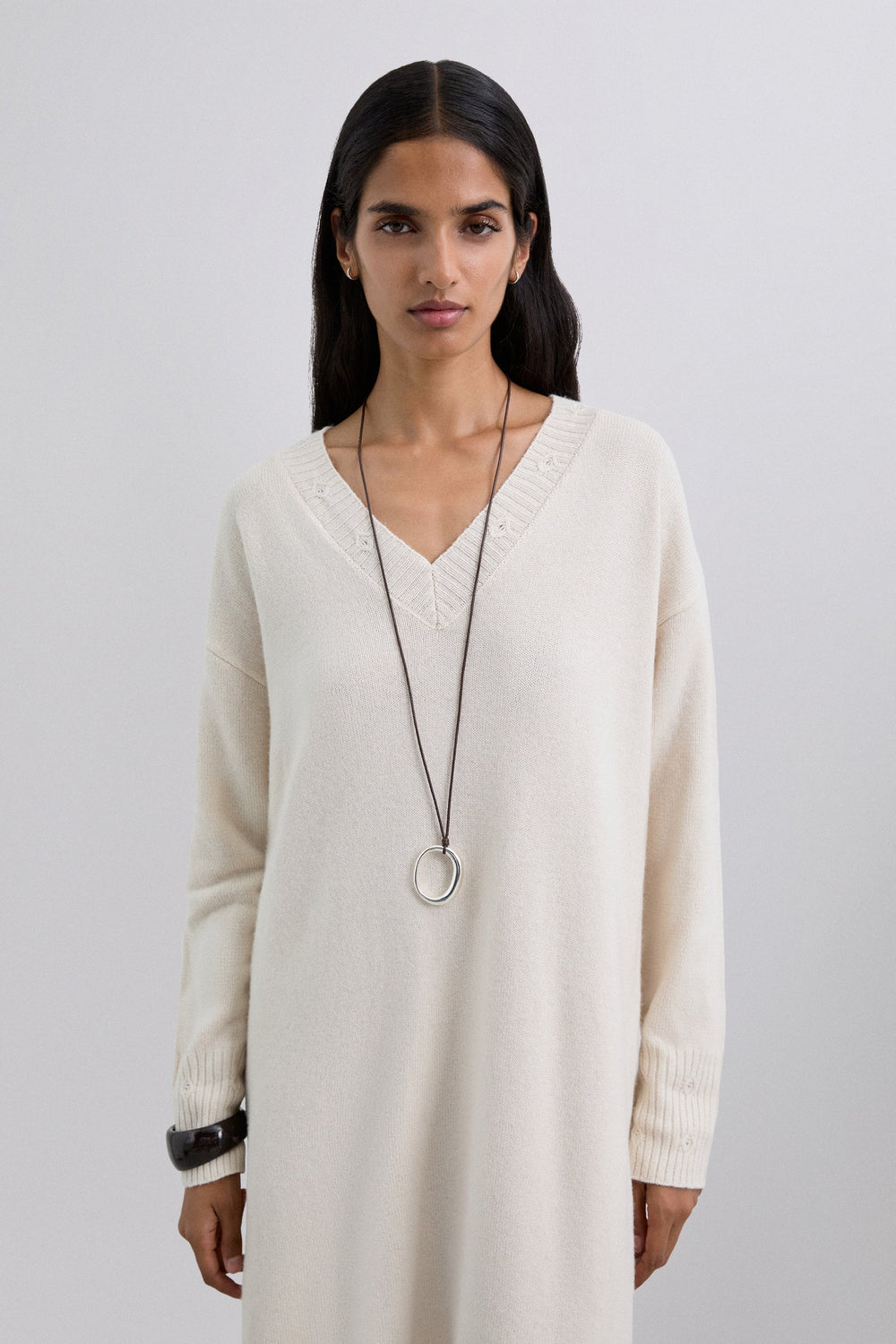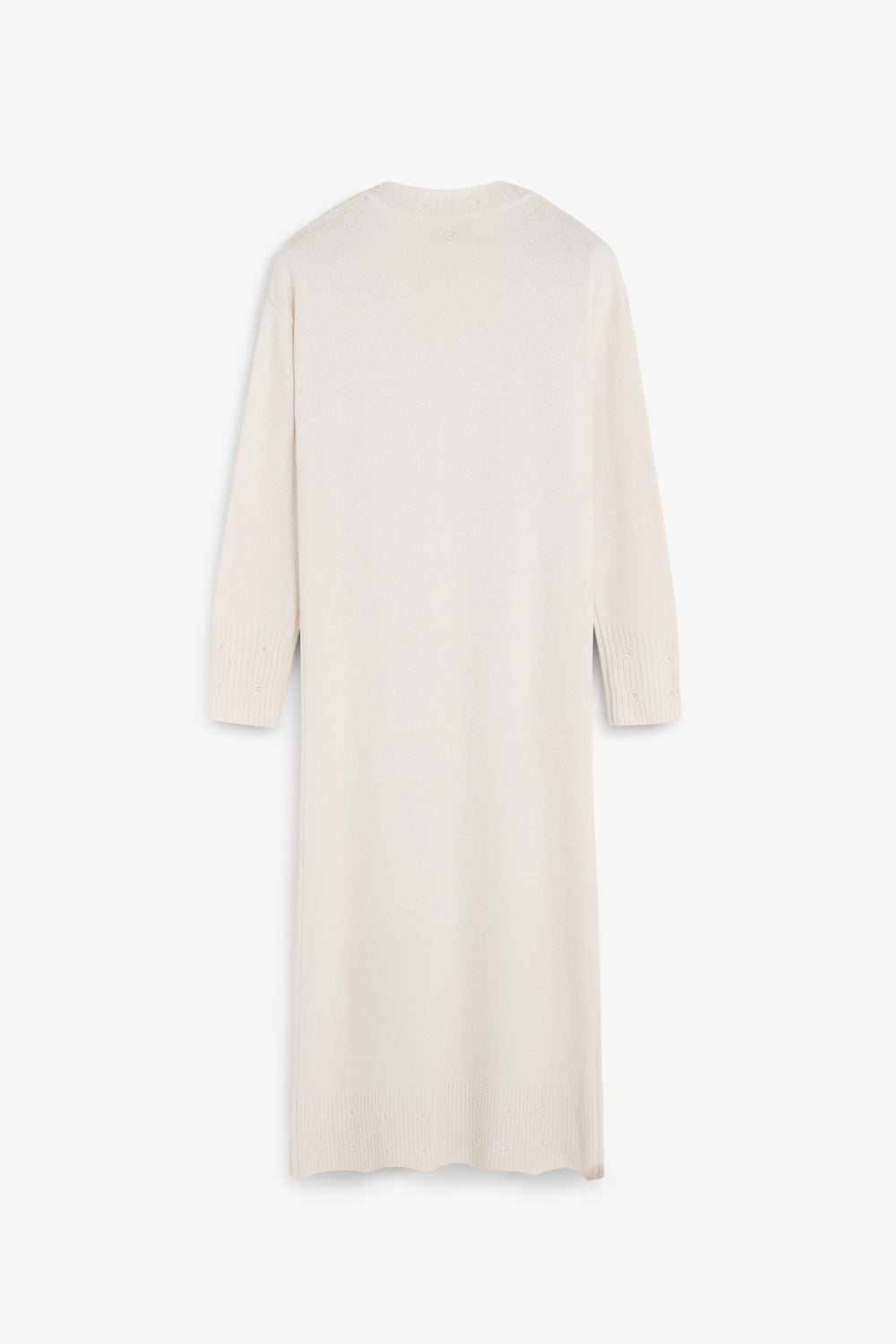 Loose-fit dress made of a wool and viscose blend. Midi length with V-neck and long sleeves. Ribbed trim on neckline, cuffs and hem with circular cut-out detailing.