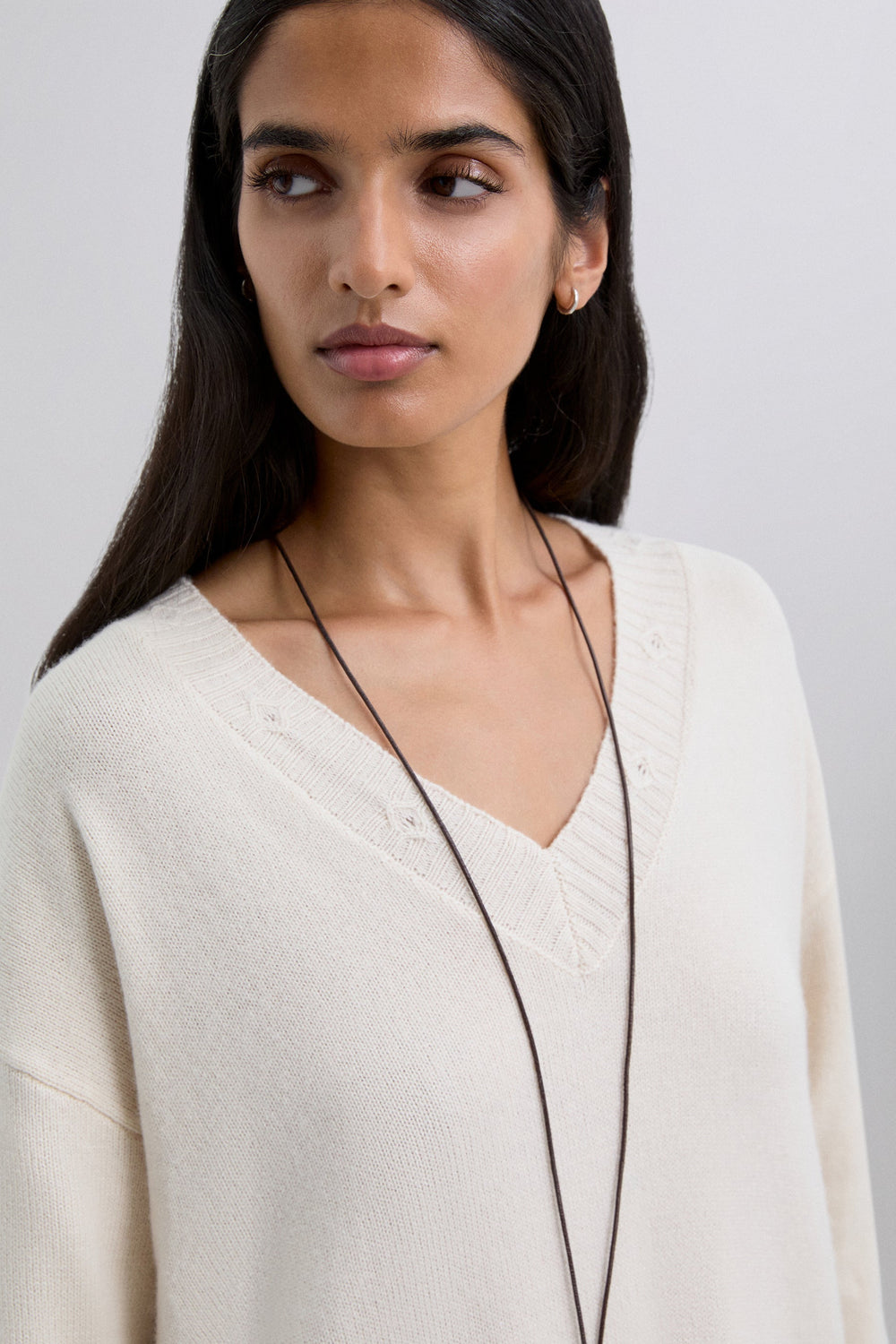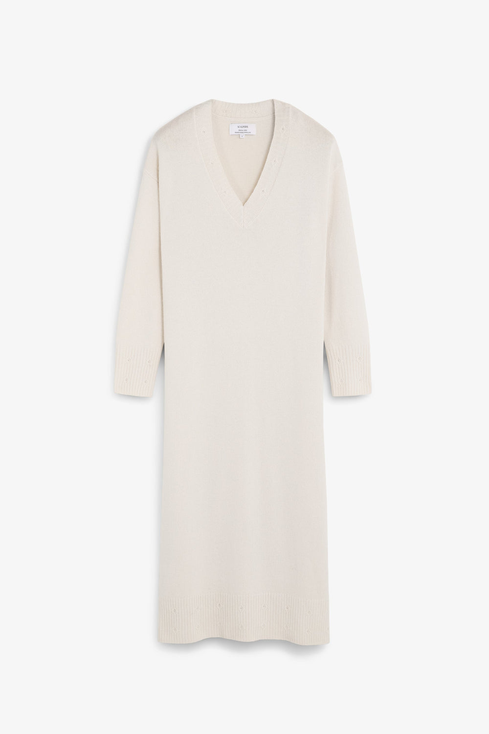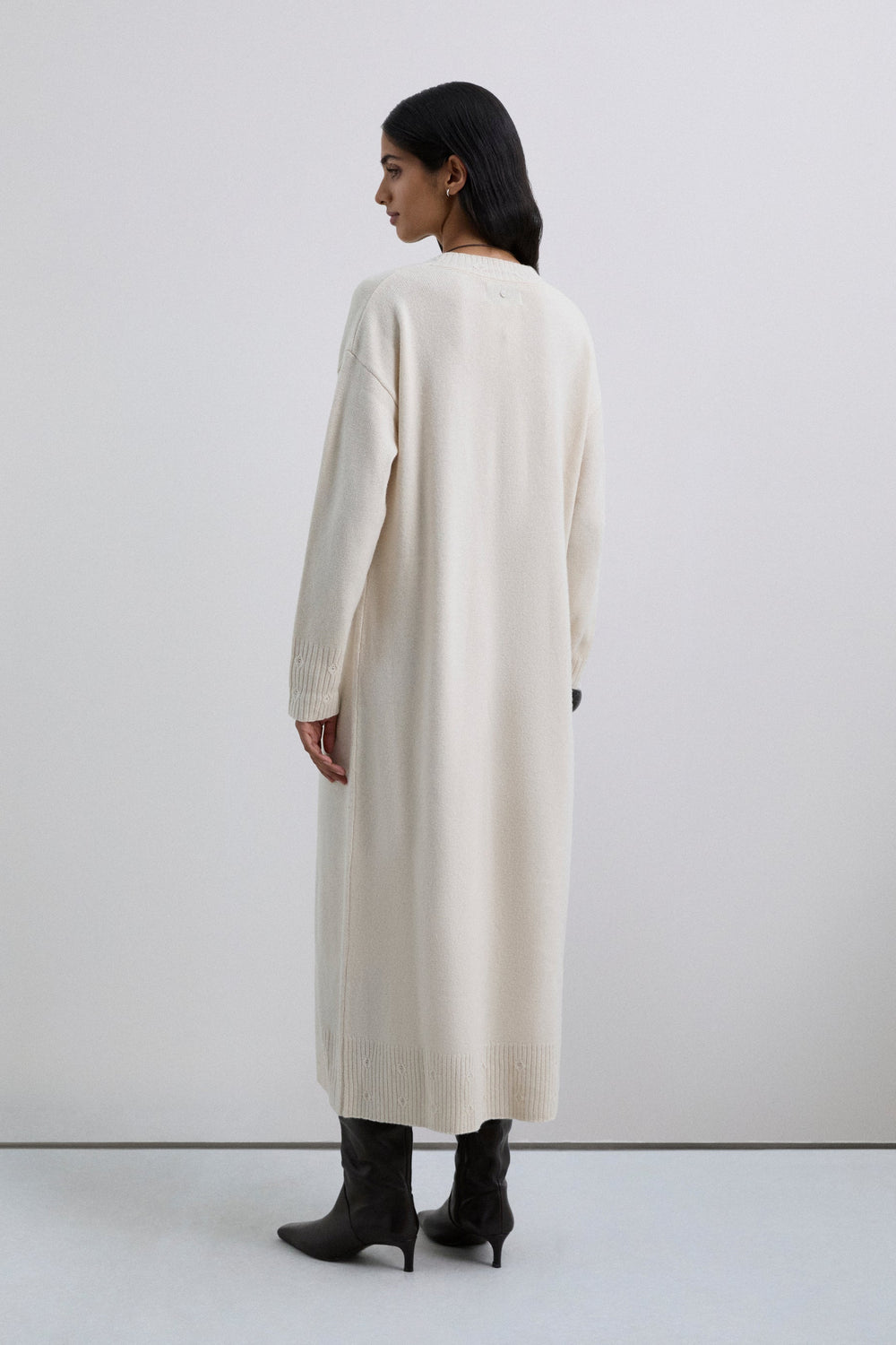 Loose-fit dress made of a wool and viscose blend. Midi length with V-neck and long sleeves. Ribbed trim on neckline, cuffs and hem with circular cut-out detailing.