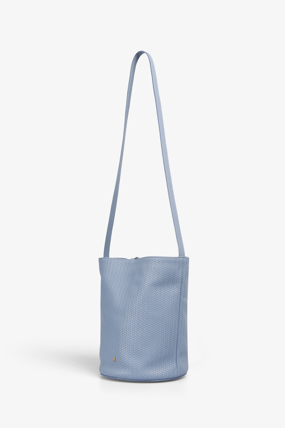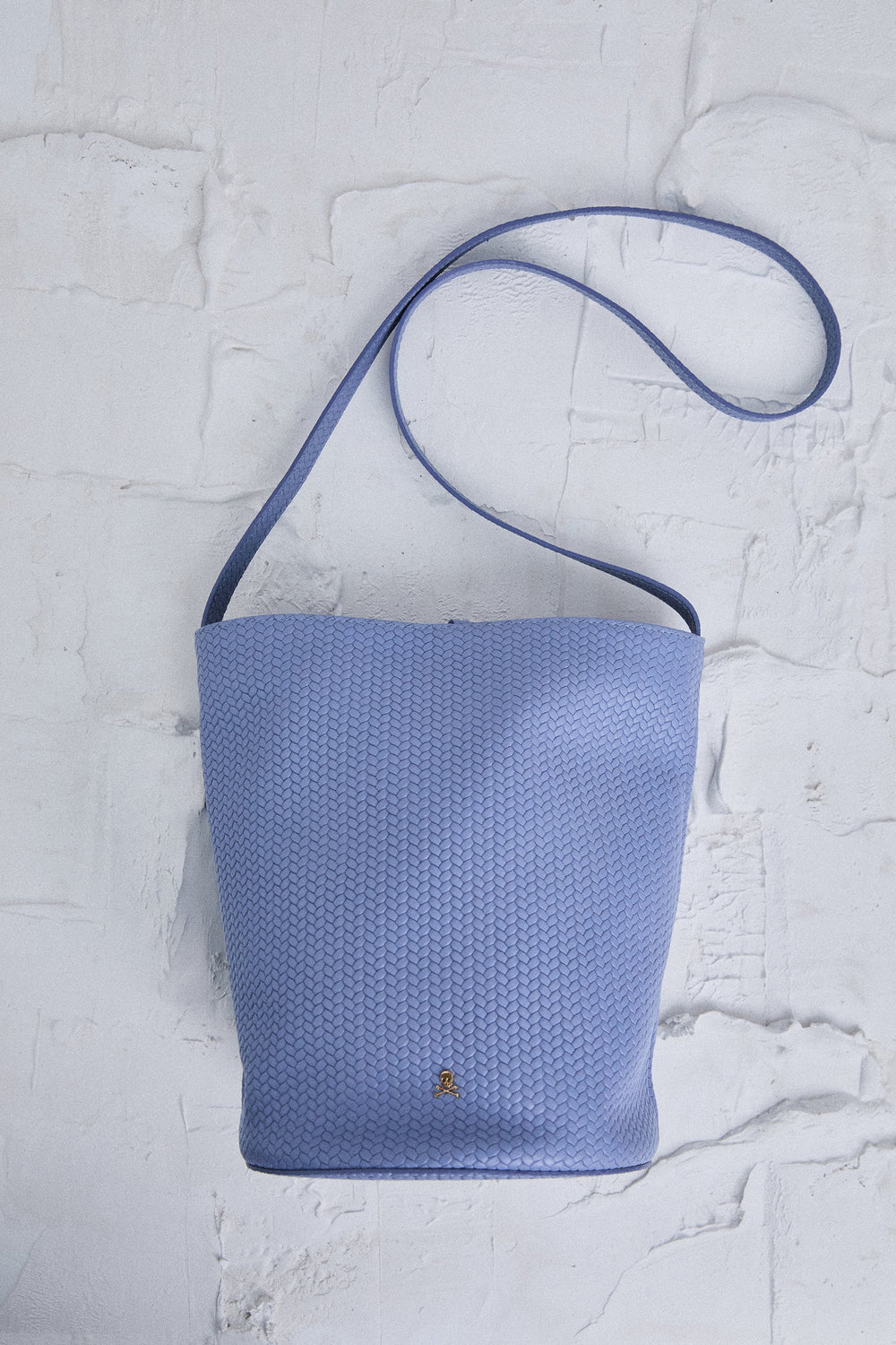 Bucket bag made of braided 100% leather. Inner lining with zipped pocket. Closes with adjustable straps. Long strap. Rubberised logo detail on the front.