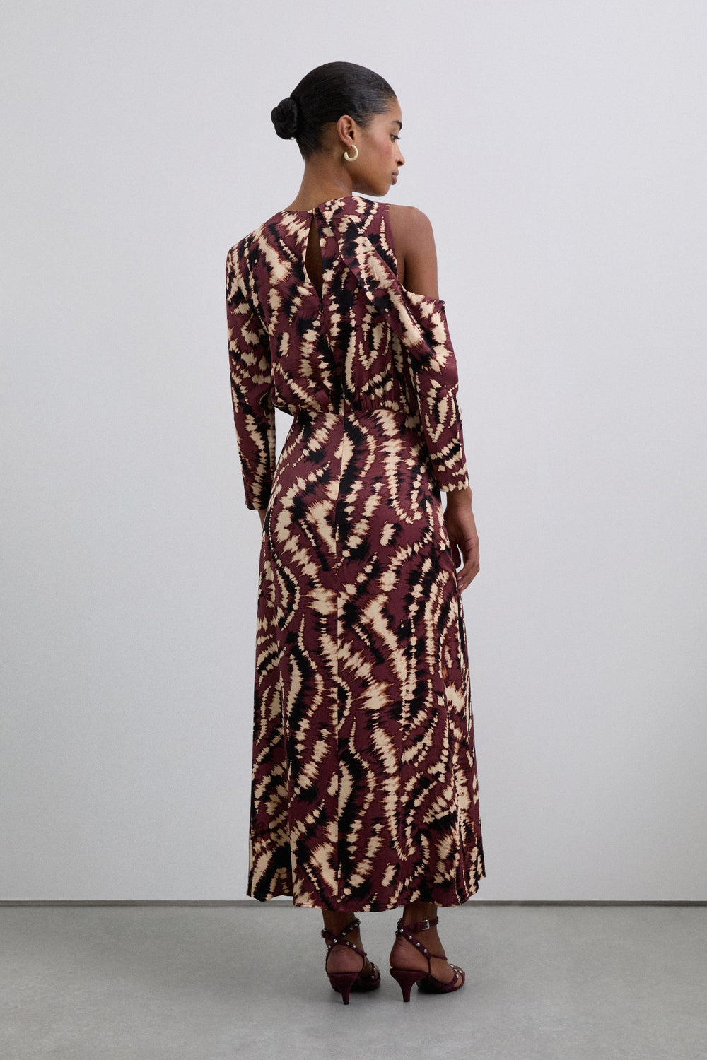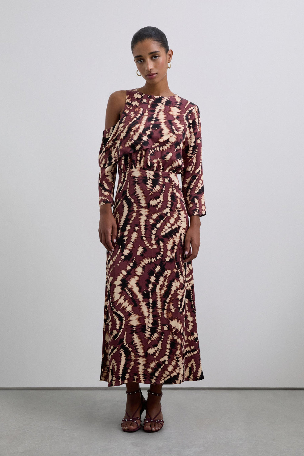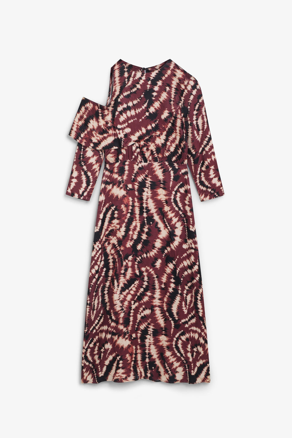 Asymmetrische jurk gemaakt van 100% viscose. Halflang model. Asymmetrische ronde halslijn. Lange mouw met schouderopeningen. Knoopsluiting achter.