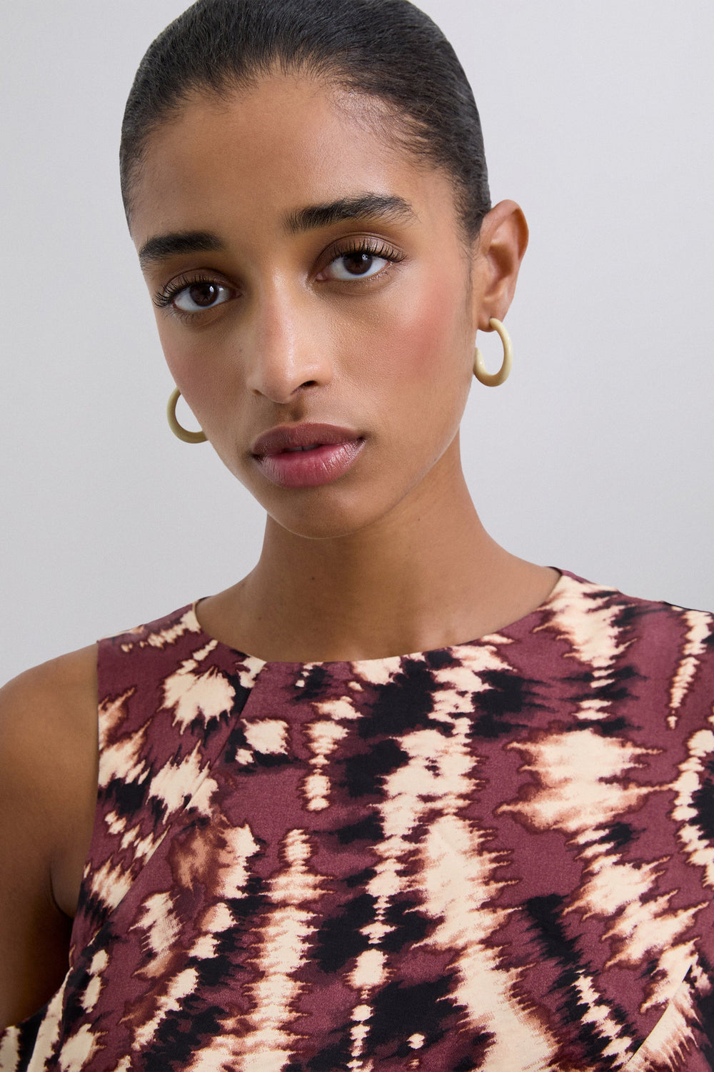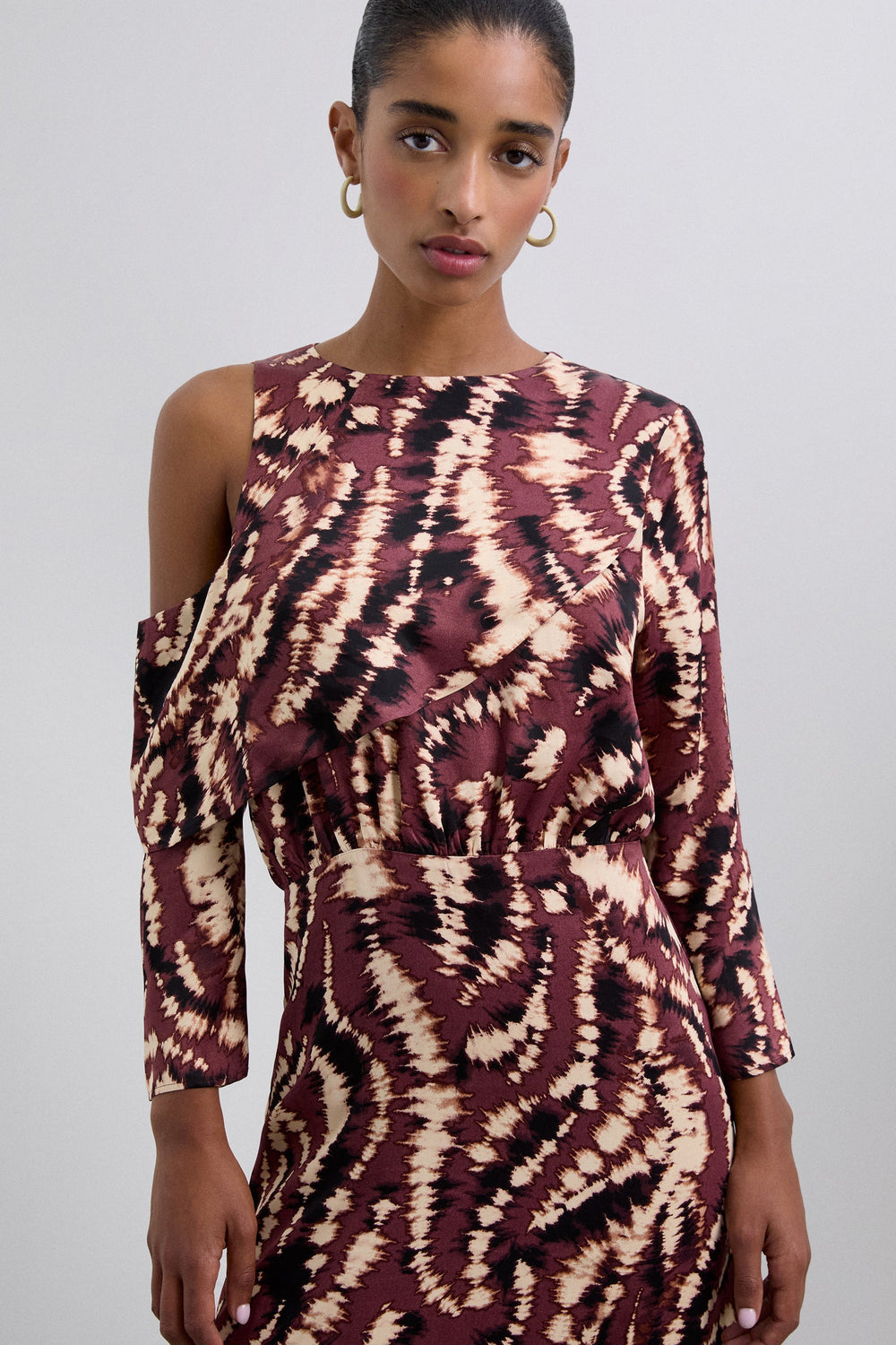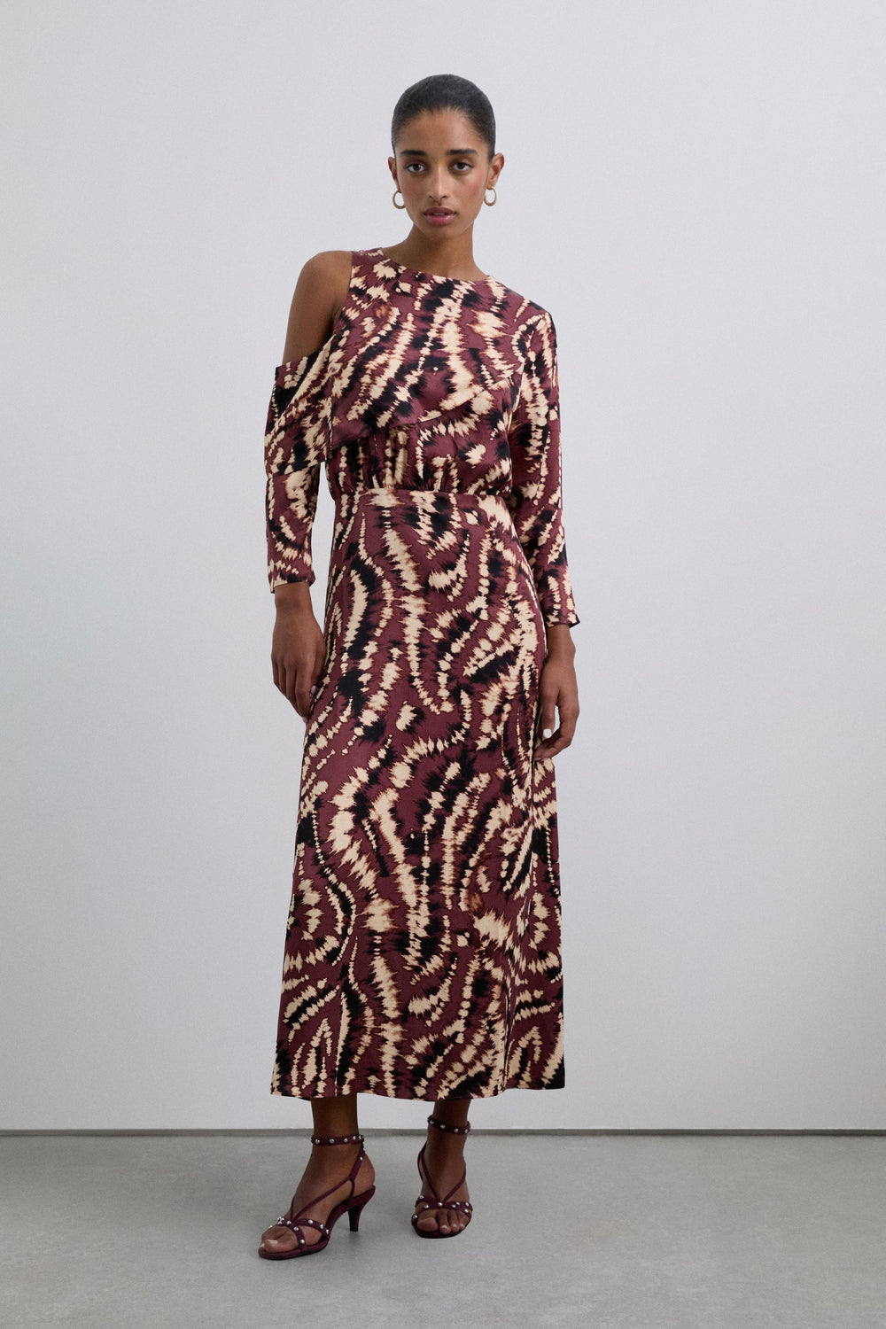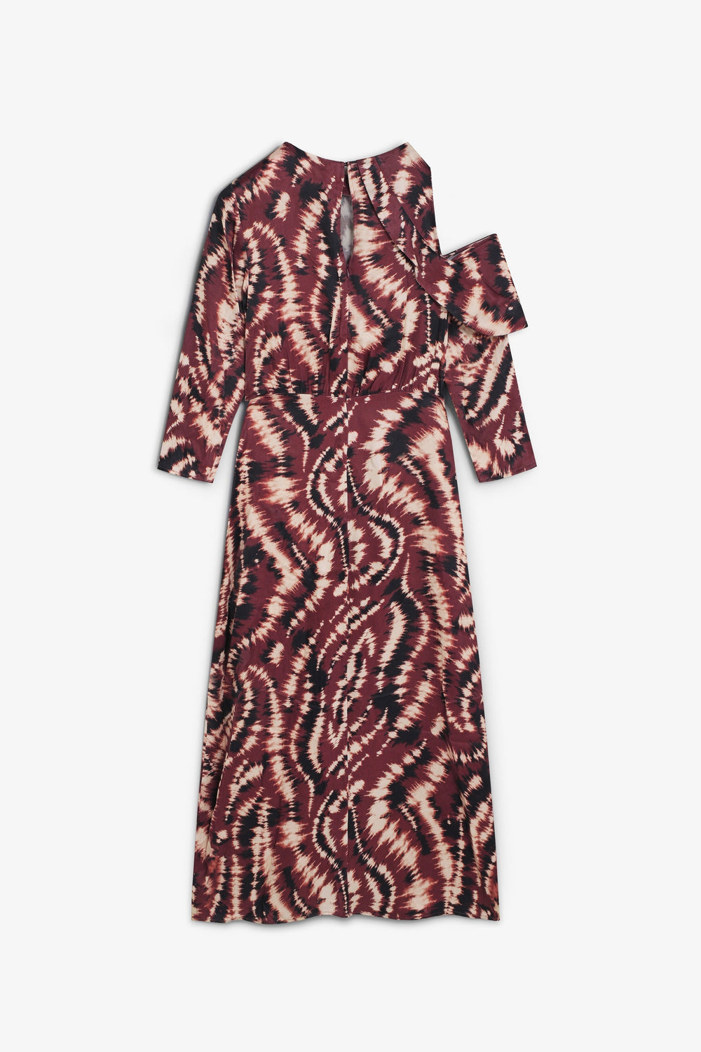 Asymmetrische jurk gemaakt van 100% viscose. Halflang model. Asymmetrische ronde halslijn. Lange mouw met schouderopeningen. Knoopsluiting achter.