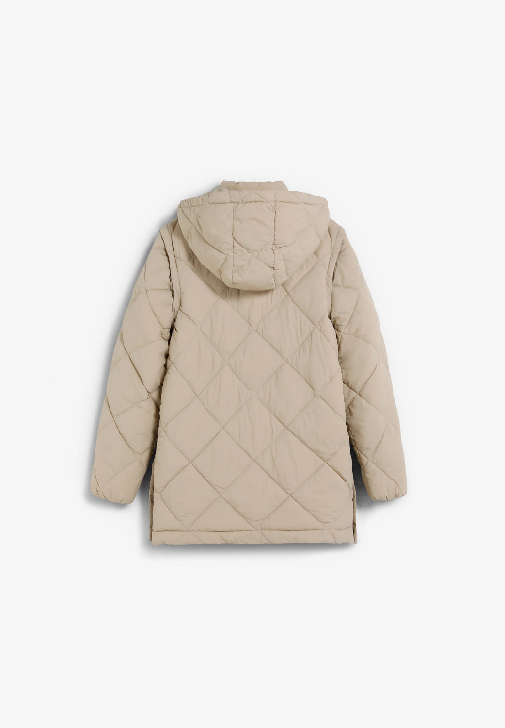 Padded coat. Detachable hood and sleeves. Front zip fastening concealed by placket with press stud fastening. Side pockets. Recycled fleece lining. Logo detail on the back.