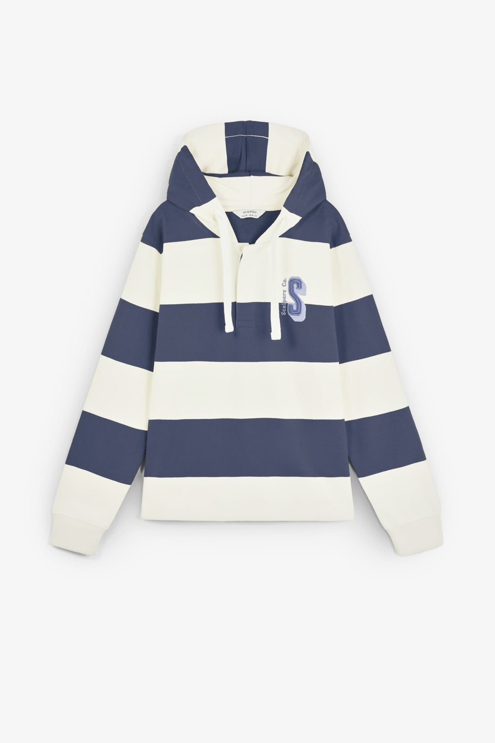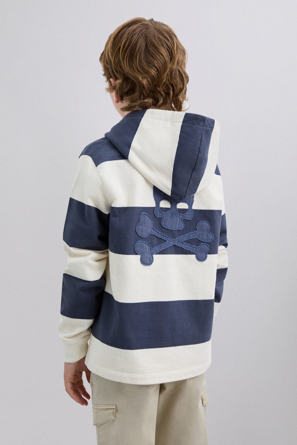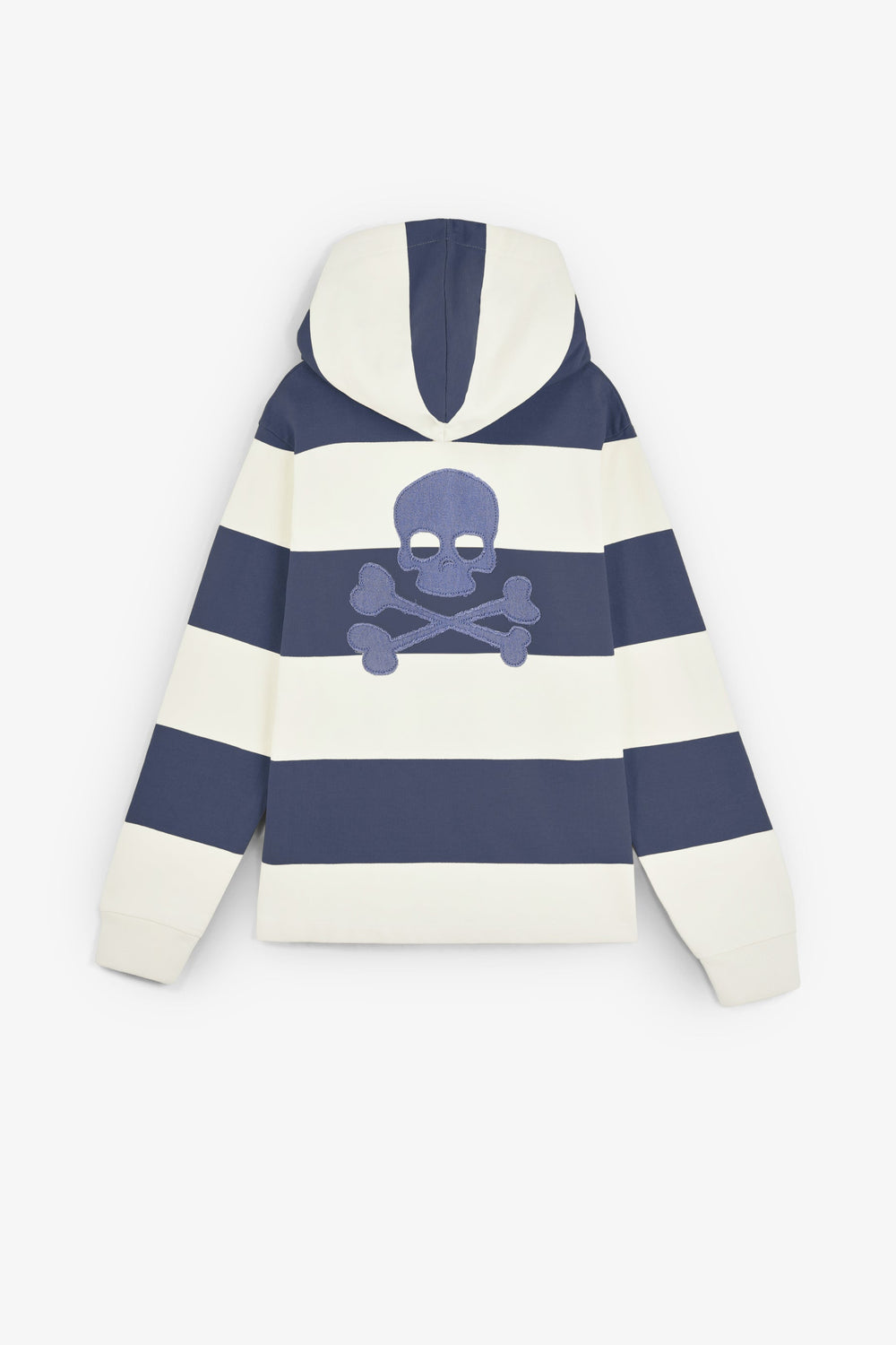 Sweatshirt with adjustable drawstring hood, made of 100% BCI cotton. Stripe print. Logo print on chest and embroidered skull on back. Half front opening.