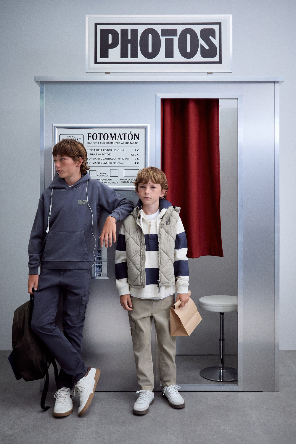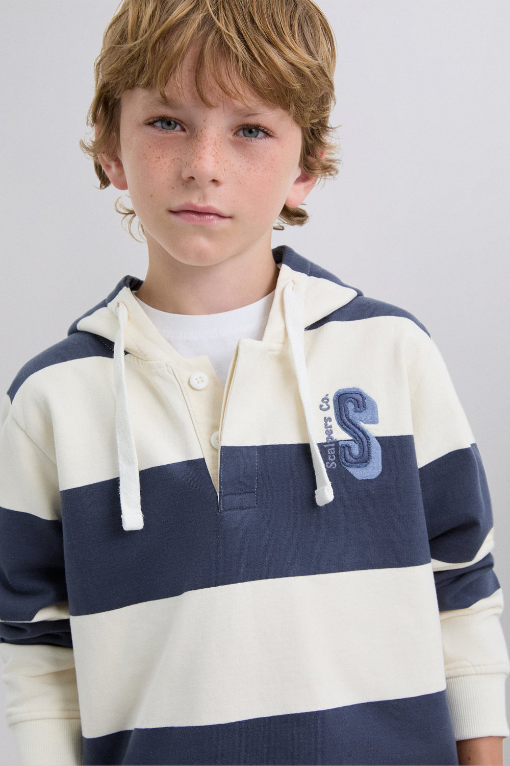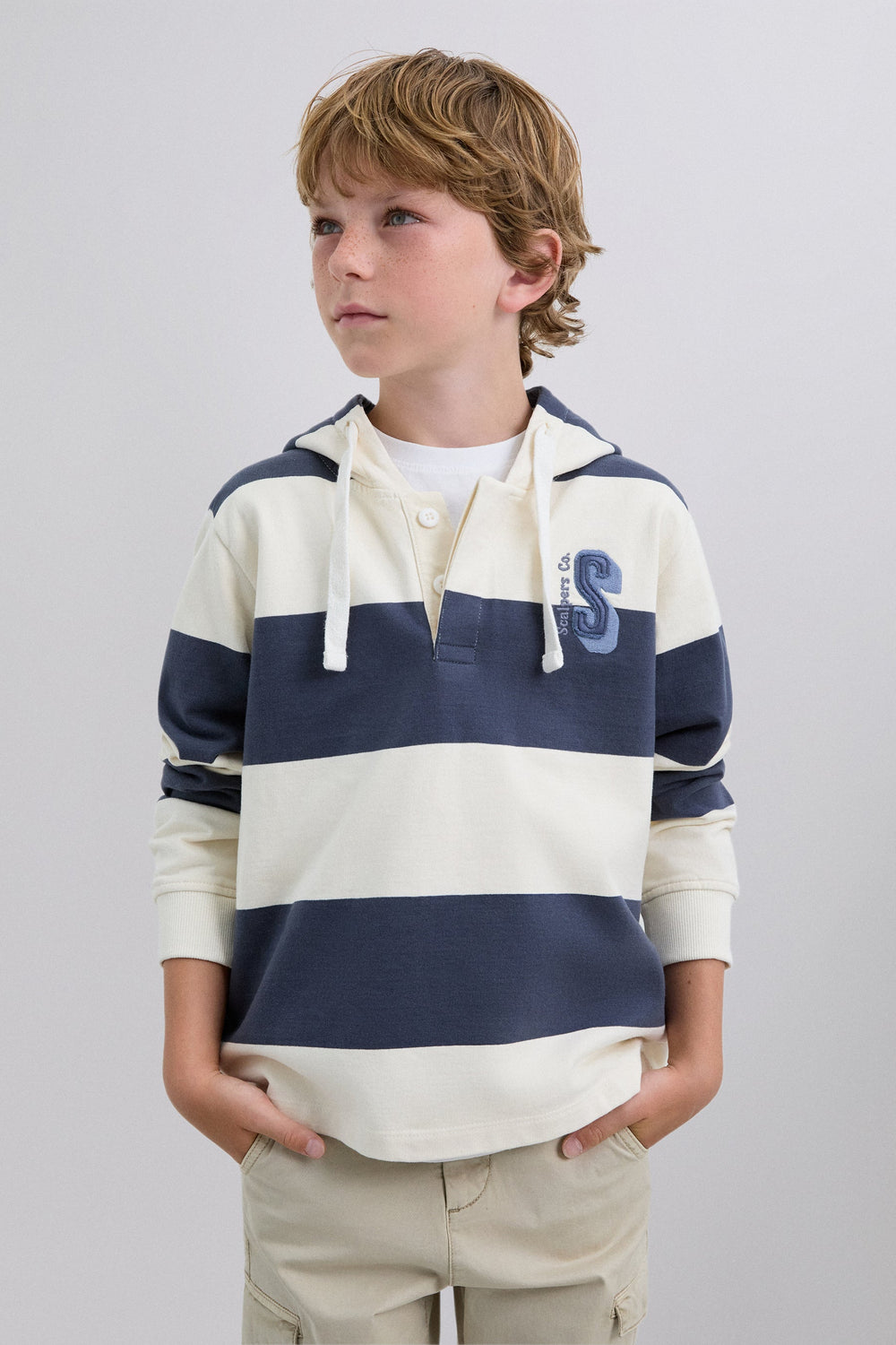 Sweatshirt with adjustable drawstring hood, made of 100% BCI cotton. Stripe print. Logo print on chest and embroidered skull on back. Half front opening.