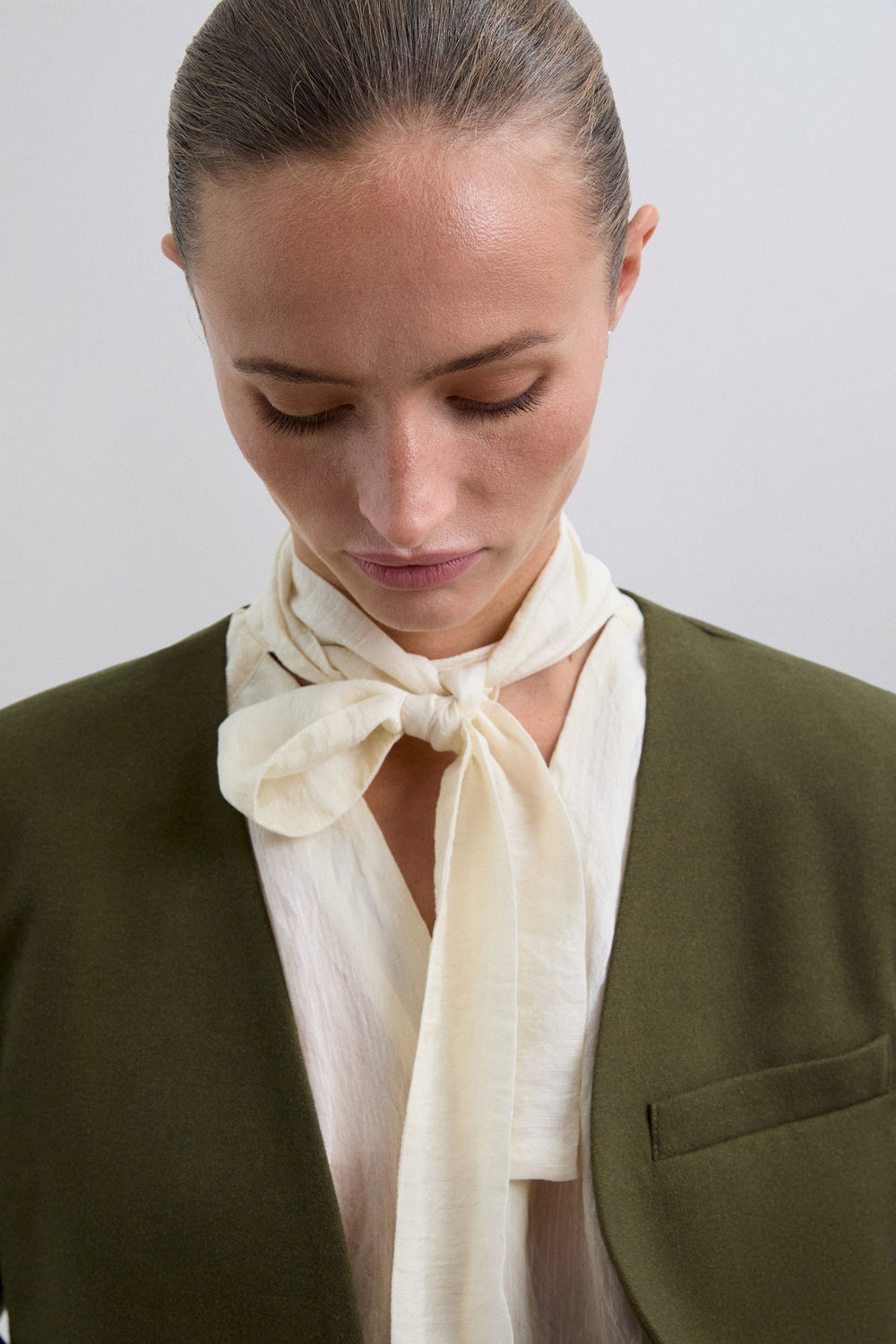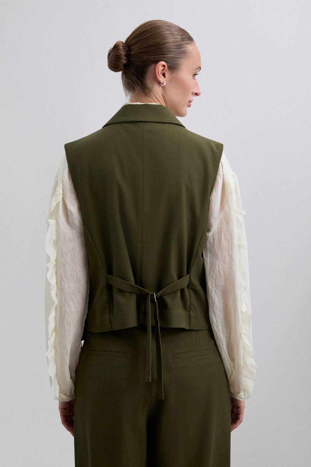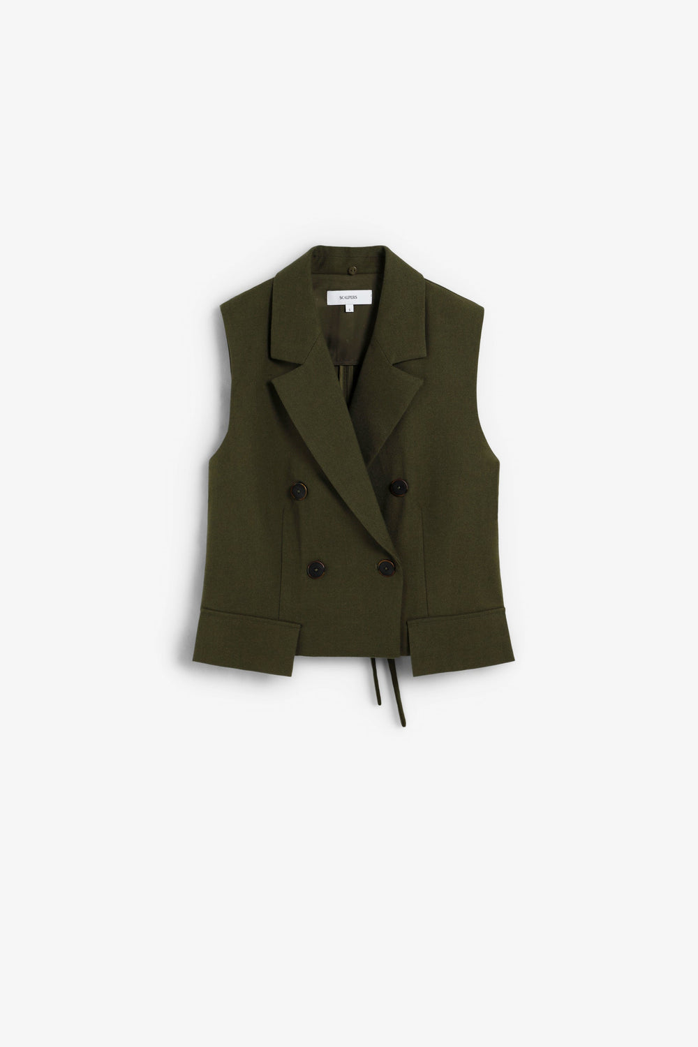 Blazer made of a viscose blend. Detachable into a waistcoat and a cropped jacket. Sleeveless waistcoat with lapel collar, button fastening and adjustable back. Cropped jacket, collar without lapel, long sleeves and chest welt pocket.