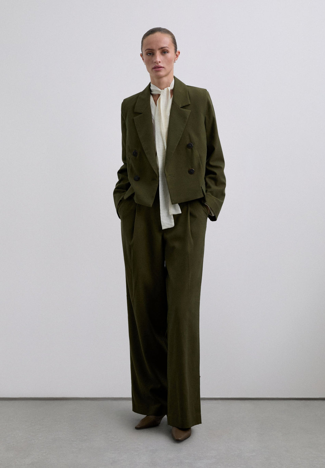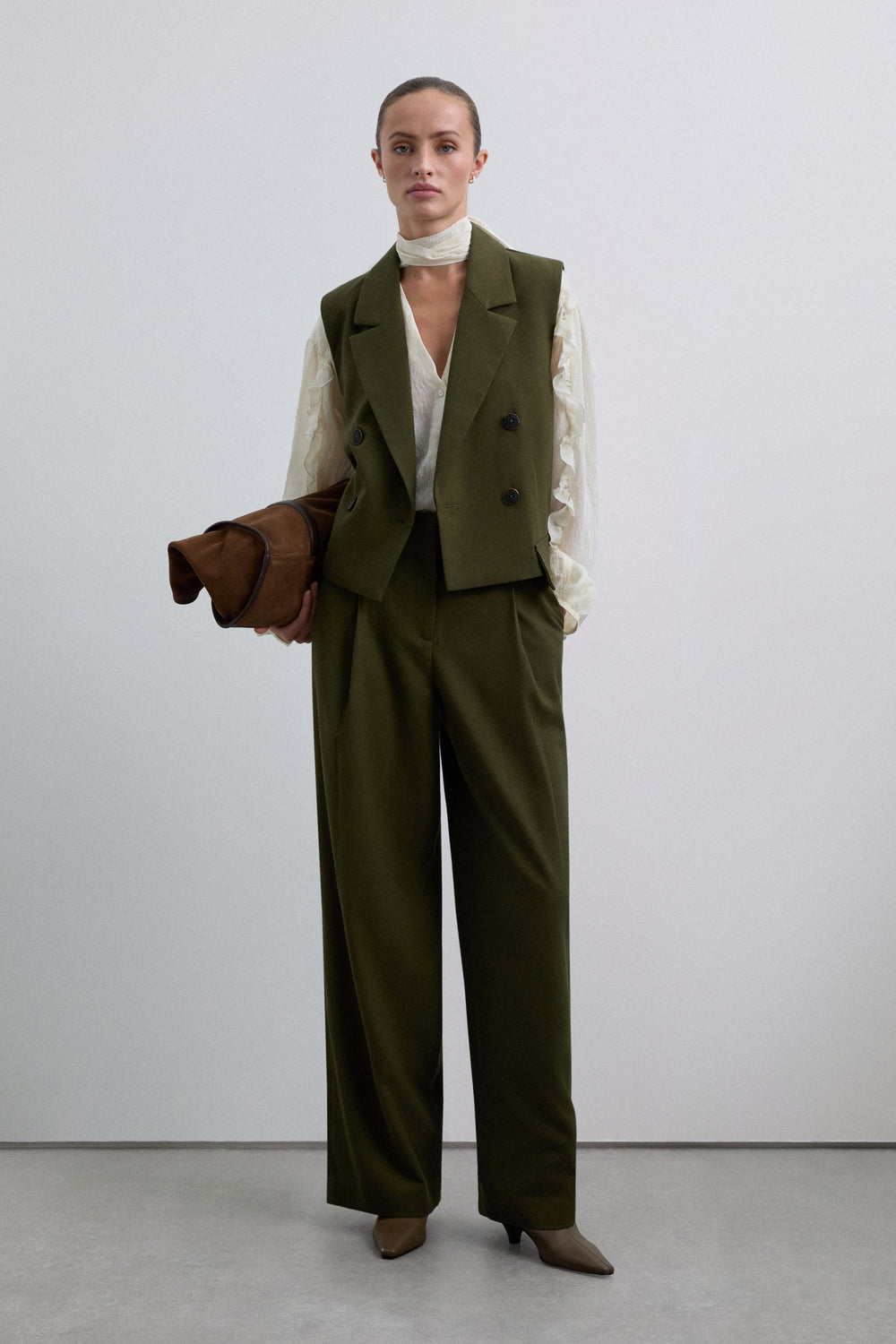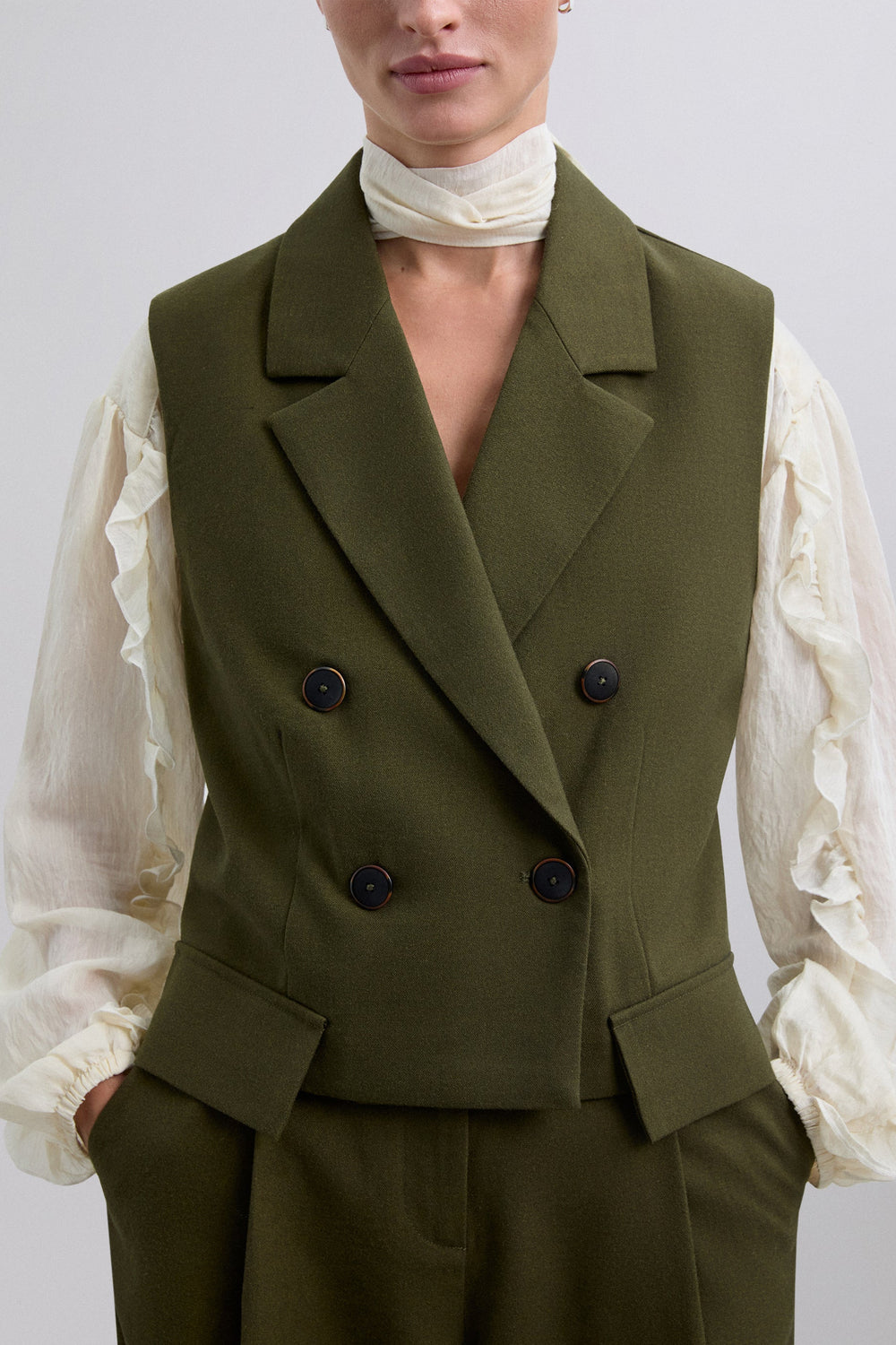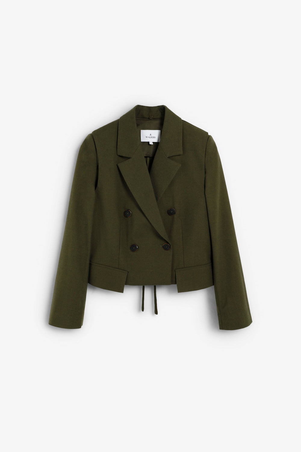 Blazer made of a viscose blend. Detachable into a waistcoat and a cropped jacket. Sleeveless waistcoat with lapel collar, button fastening and adjustable back. Cropped jacket, collar without lapel, long sleeves and chest welt pocket.