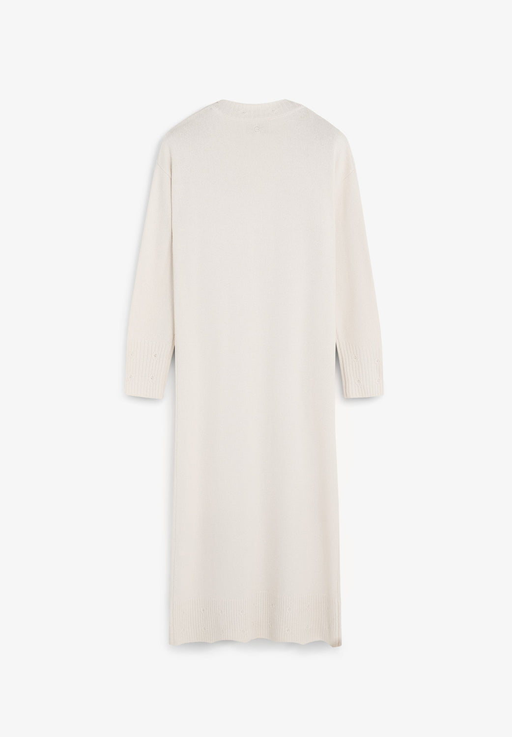 Loose-fit dress made of a wool and viscose blend. Midi length with V-neck and long sleeves. Ribbed trim on neckline, cuffs and hem with circular cut-out detailing.