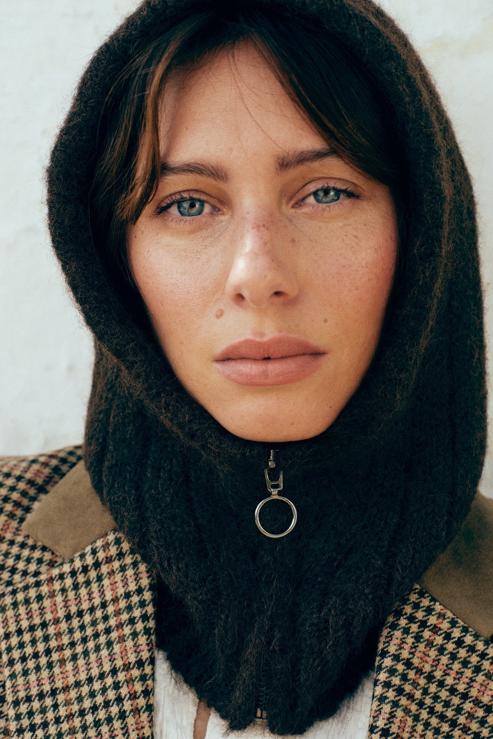Balaclava made of knitted wool and elastane blend. Front zip fastening.