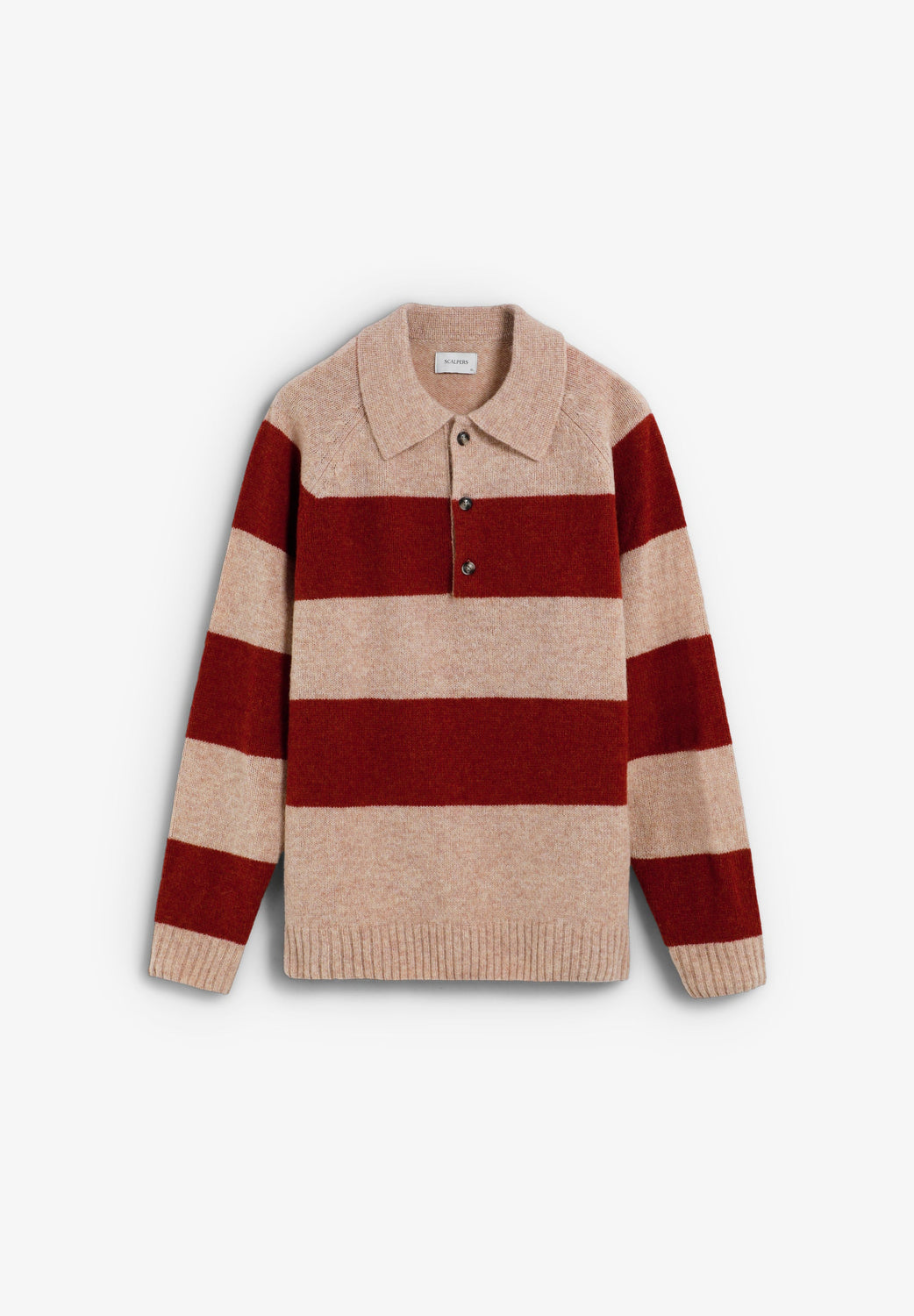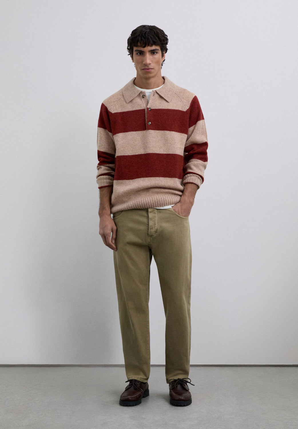 Sweater made of 100% wool. Polo shirt collar with buttons. Stripe print. Long sleeves. Regular fit.