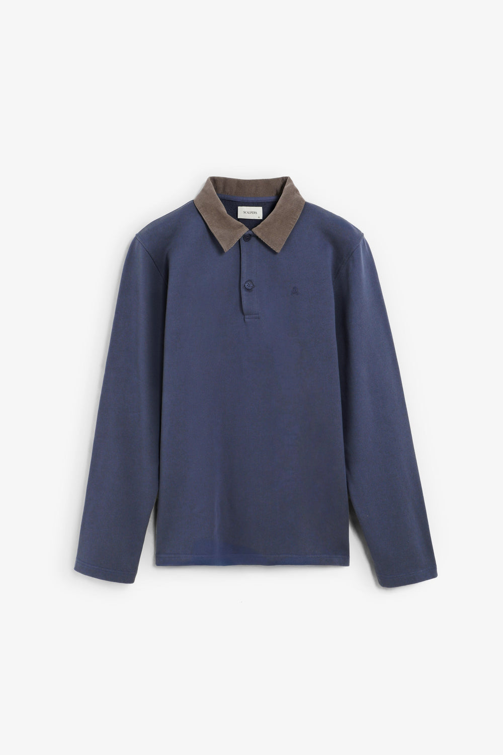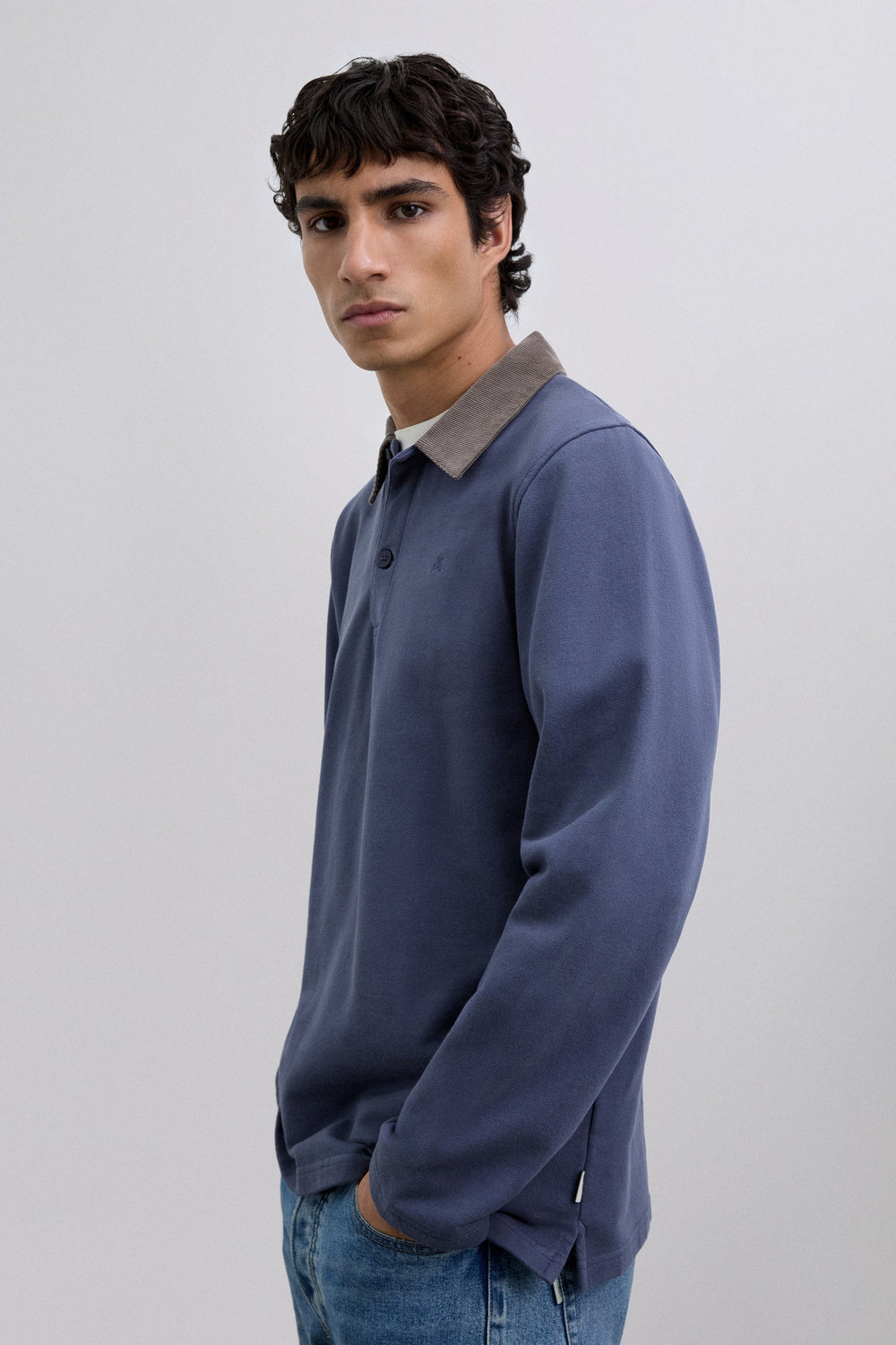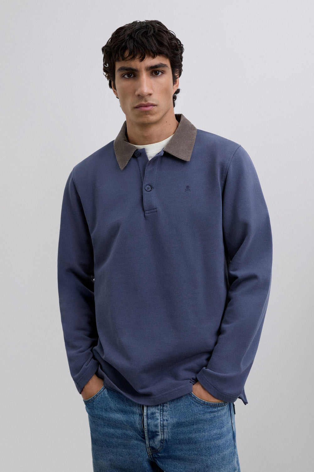 Polo shirt made of 100% BCI cotton. Contrast corduroy collar with button fastening. Long sleeves. Matching embroidered logo on the chest.