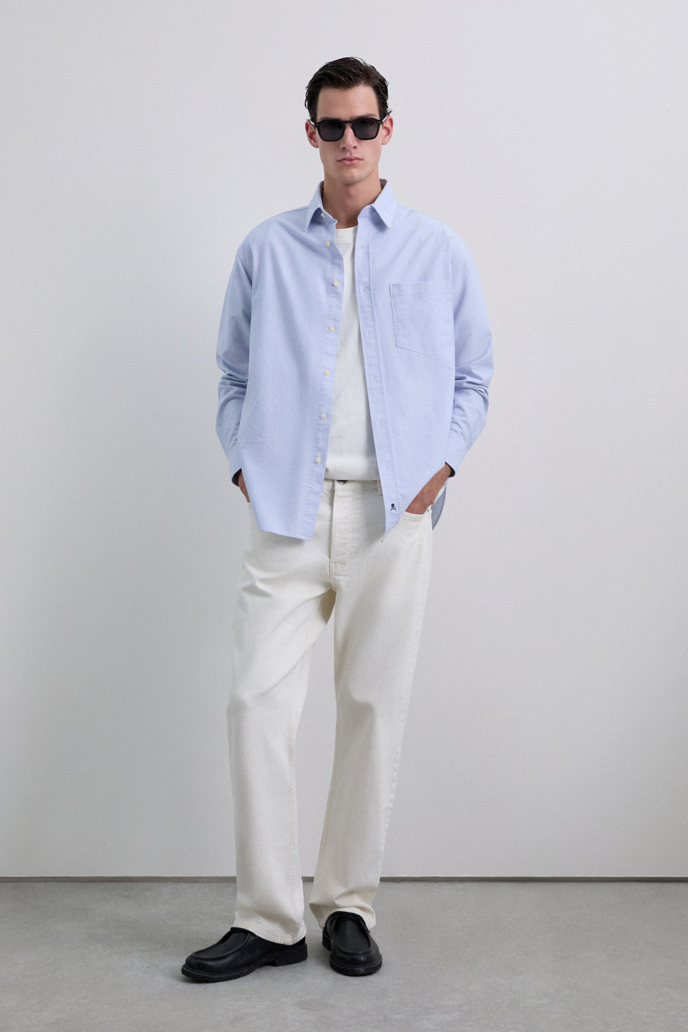 Shirt made of 100% BCI cotton. Stripe print. Chest pocket detail. Long sleeves. Button fastening at front and cuffs. Contrast embroidered skull detail on the lower front.