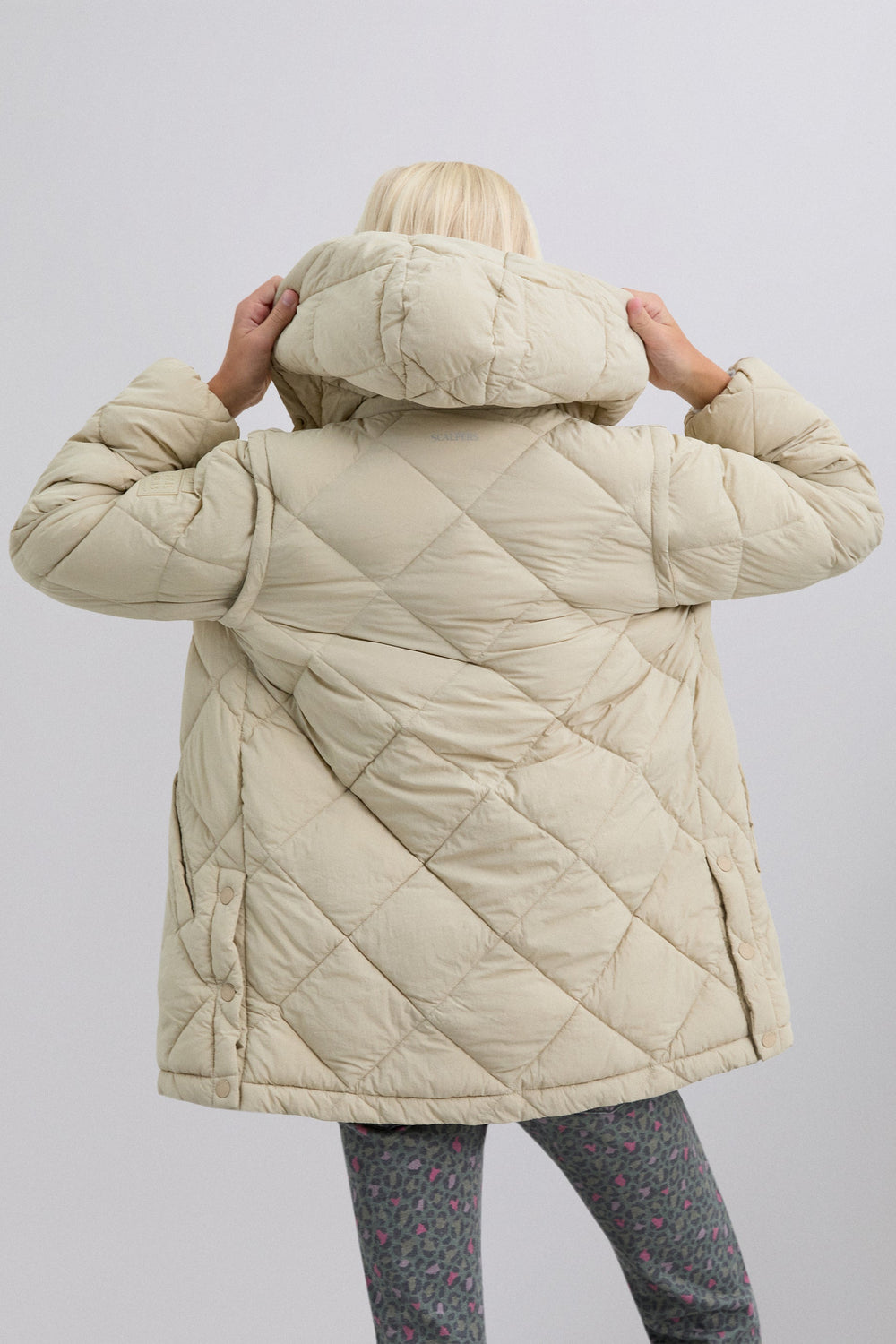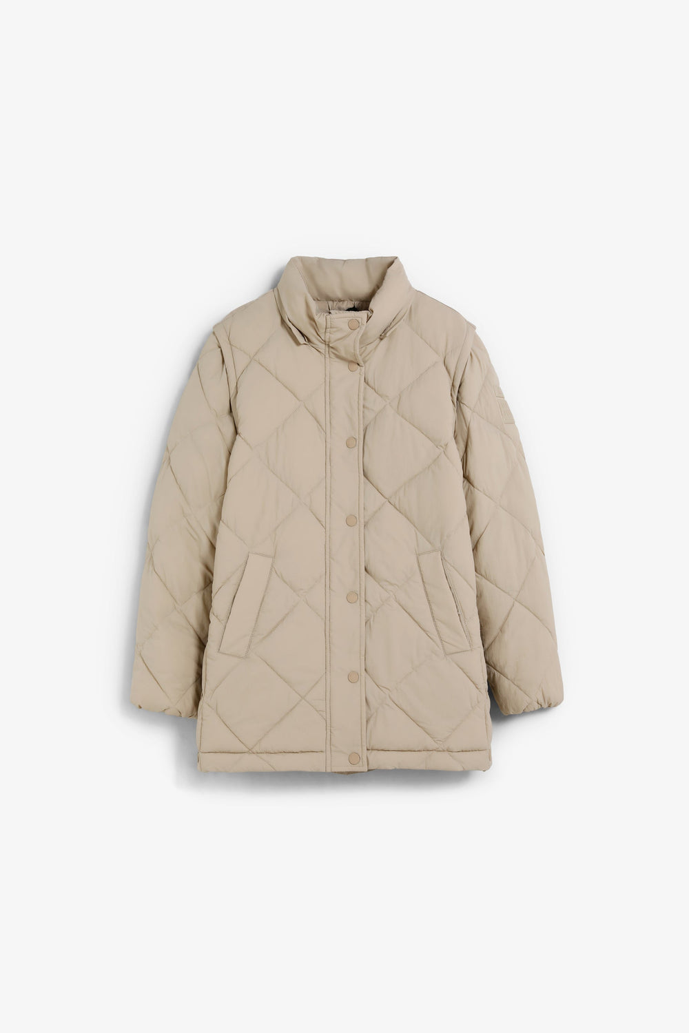 Padded coat. Detachable hood and sleeves. Front zip fastening concealed by placket with press stud fastening. Side pockets. Recycled fleece lining. Logo detail on the back.